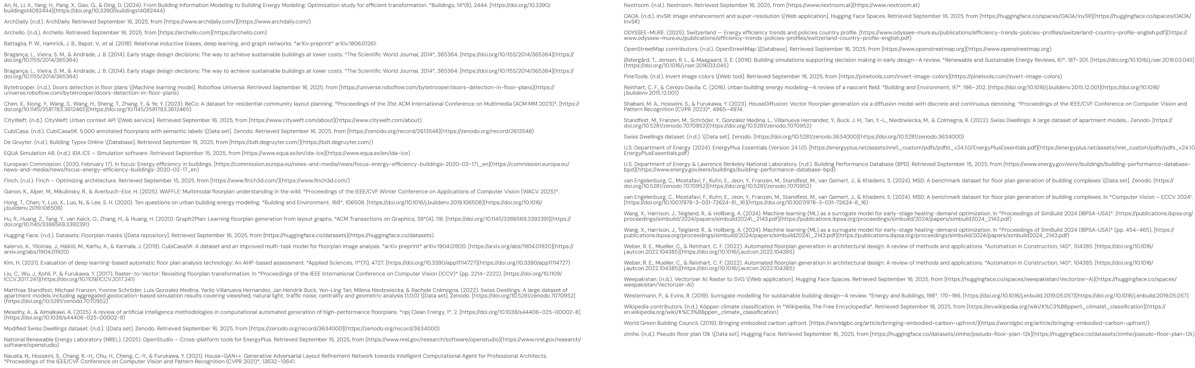 What remains largely missing is an integrated dataset that combines architectural layouts with geospatial information, climate context, and building performance simulation results. Existing floorplan datasets are either synthetic or limited to geometric annotations, with little or no connection to environmental data. Conversely, energy simulation databases are rich in performance metrics but lack spatial and geometric descriptions of building layouts. This disconnect highlights a gap in current research: the absence of comprehensive datasets that enable performance-informed generative design in architecture (Weber et al., 2022; Chen et al., 2023).
