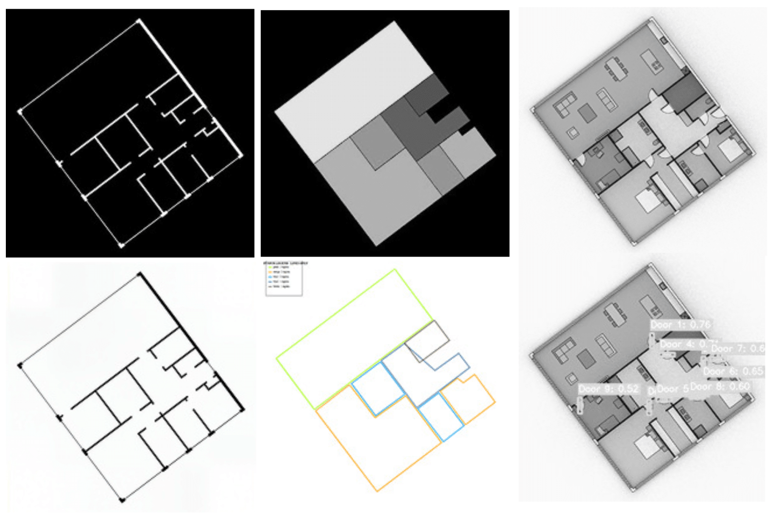 For room types, we generated PNG images and extracted outlines of each color group, exported them as SVG, and imported them into Grasshopper. Door locations were obtained using a Roboflow door detection model, which produced rectangles corresponding to door positions. All these preprocessing steps, including image enhancement, vectorization, and model-based detection, were performed in Visual Studio.