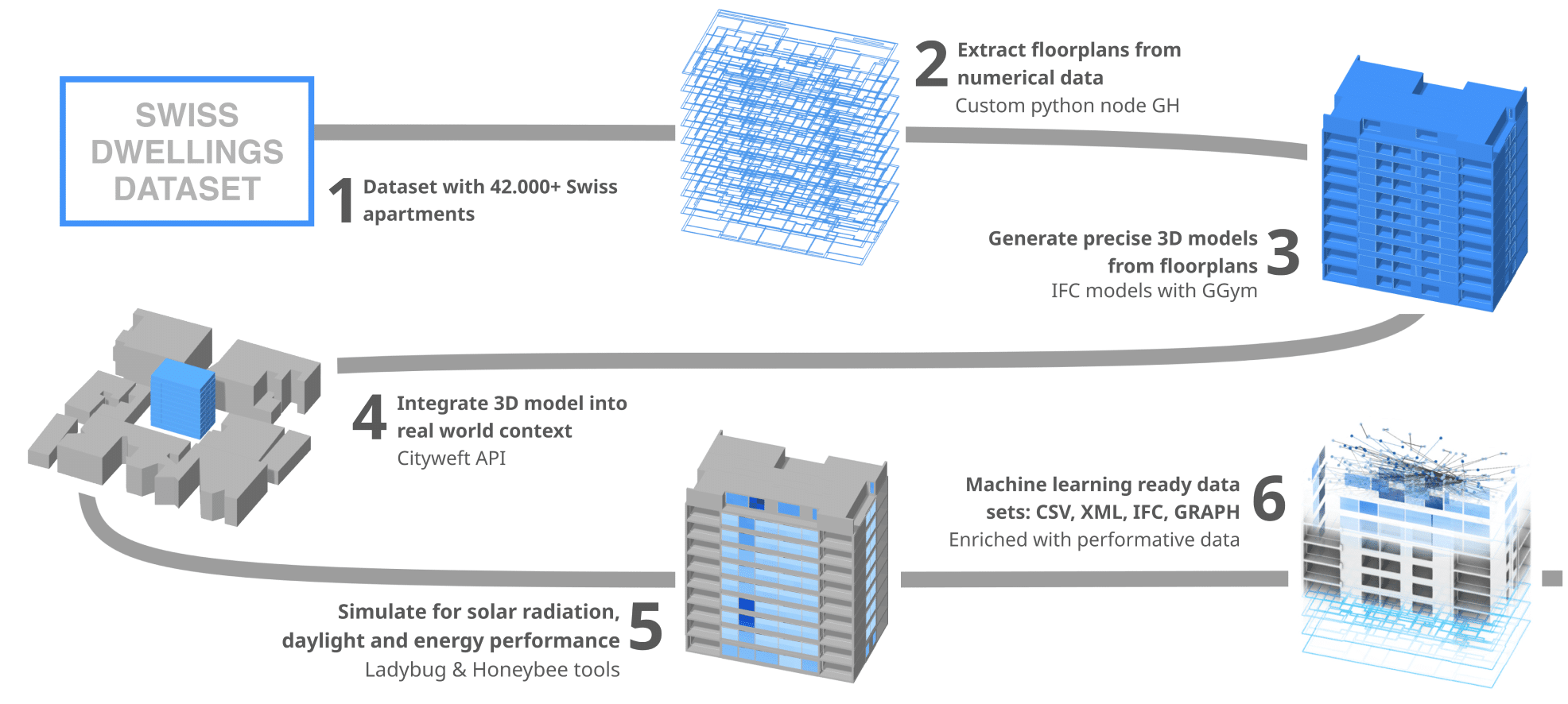 Our computational pipeline that turns the Swiss Dwellings CSVs into a simulation-enriched, multi-format dataset. We begin in Grasshopper, where we parse the relational tables (areas, openings, separators) into per-storey 3D reconstructions with consistent data-tree structures and stable IDs. Each building is then situated in a plausible urban context and mapped to an EPW climate file; with that scaffold we run Ladybug Tools simulations directly on the Grasshopper model—room grids and window proxies—using uniform tolerances.