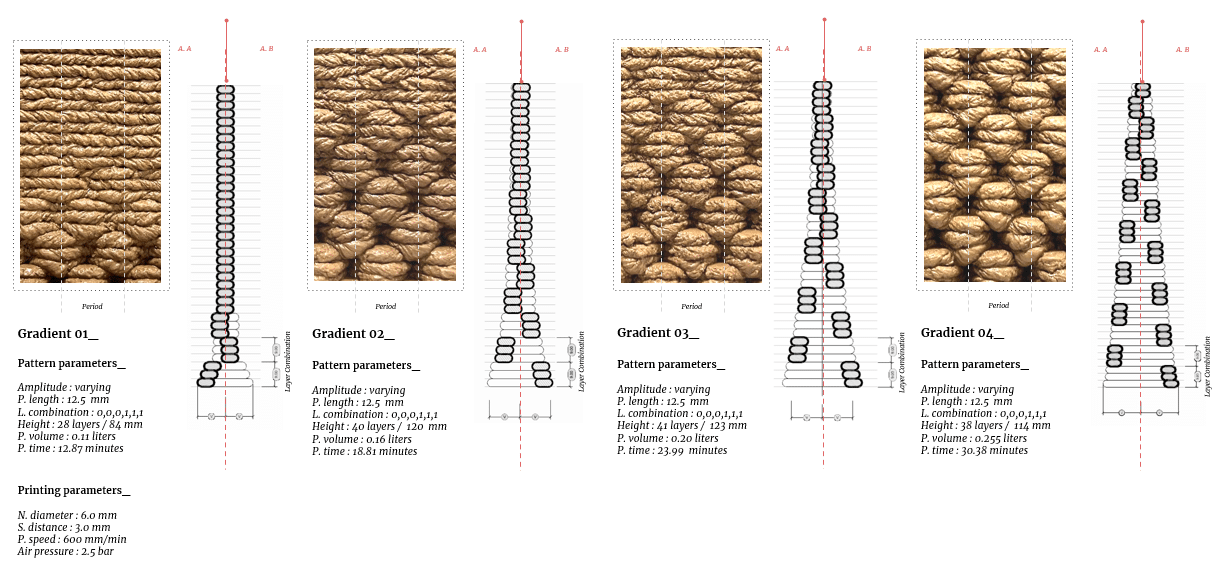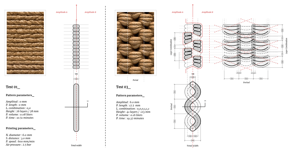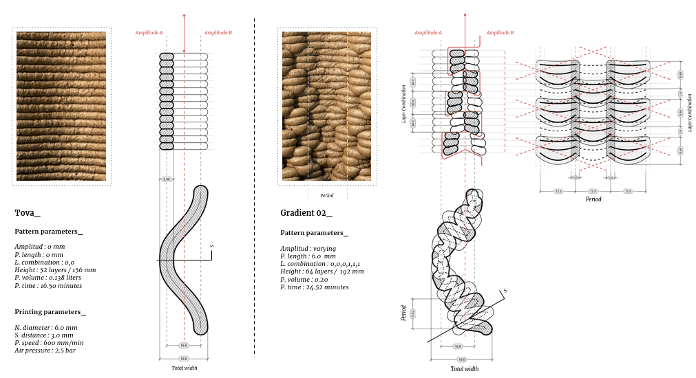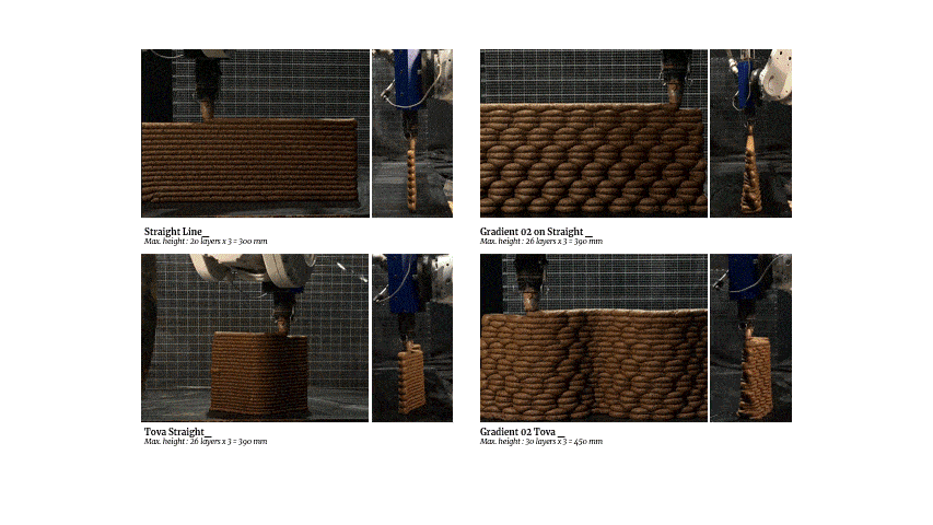 These findings form a strong basis for the next phases using earthen materials at larger scales. They confirm that pattern geometry contributes directly to structural stability during deposition, even before drying increases material strength.