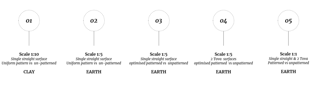 Overall, the comparison across scales shows that the structural logic of patterning is indeed scalable: the stability improvements observed at 1:5 translate to 1:1, though with moderated gains and proportionally higher time requirements. These outcomes confirm that patterning can serve as a valid architectural-scale strategy for enhancing wet-state stability in both straight and periodic earthen geometries.
