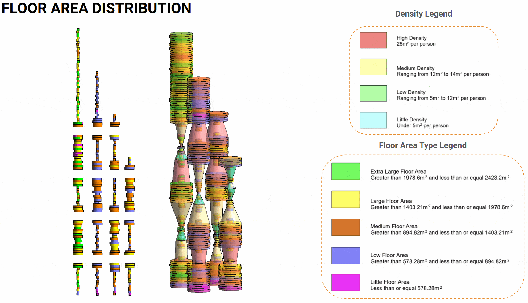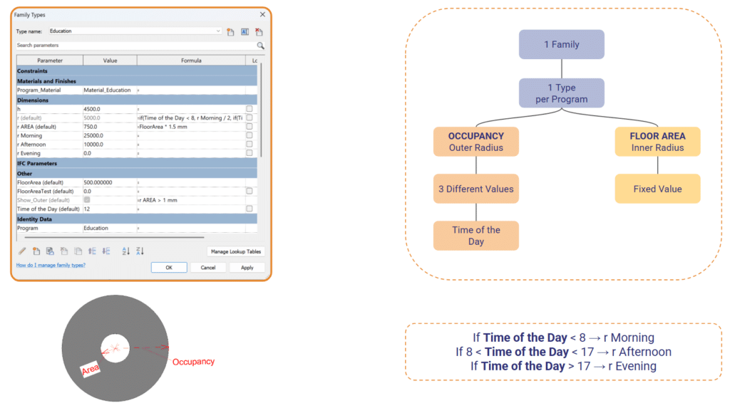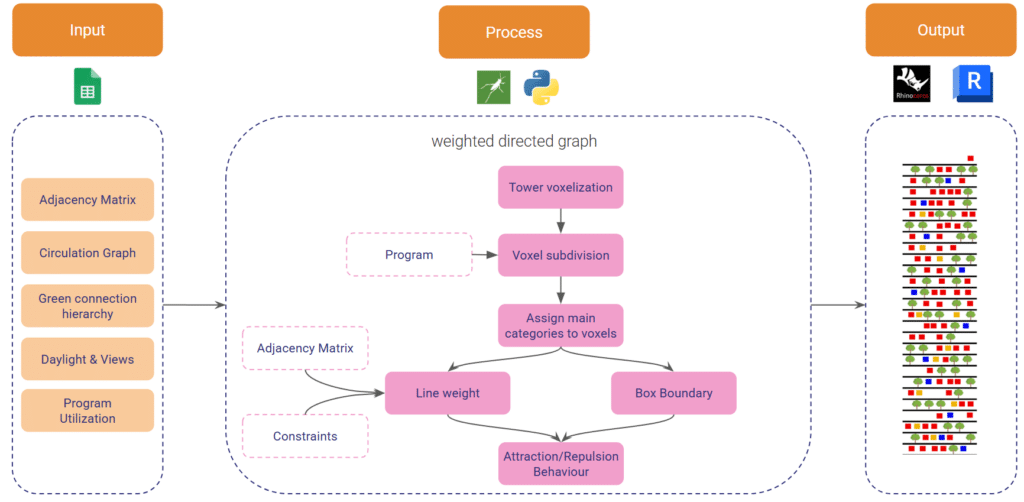 This workflow translates program data into spatial geometry through a parametric pipeline. Inputs such as program location, occupancy, floor area, and tower assignment are processed in Grasshopper and pushed into Revit as families. This enables automated generation of building elements while maintaining consistency between data and design, allowing quick iterations and a coherent, data-driven workflow.