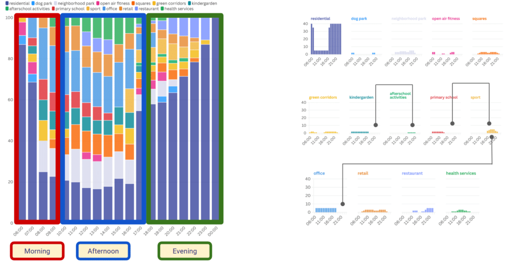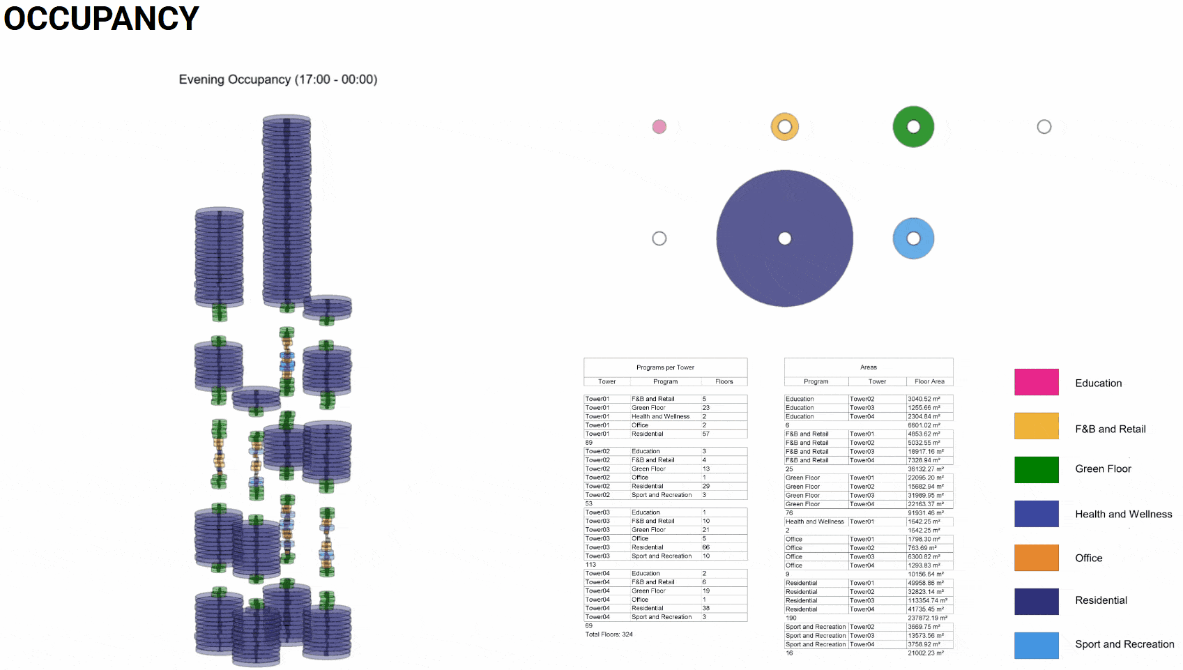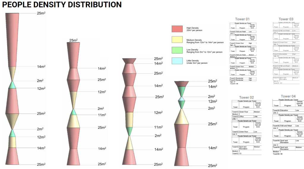We conducted an occupancy study to understand how the use of different programs shifts throughout the day, comparing morning, afternoon, and evening patterns. This analysis highlights peak activity periods across residential, commercial, educational, and public functions, revealing how spaces are activated over time. These insights help inform more efficient program distribution and support better spatial and operational performance within the building.