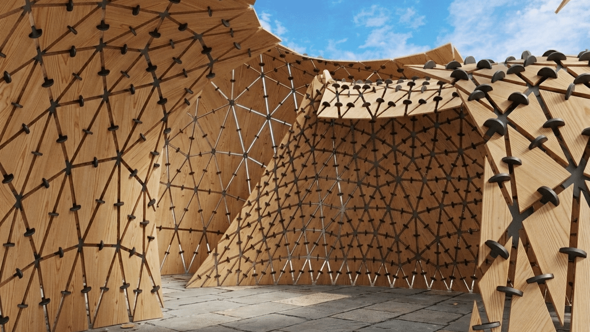 Designed for the IAAC rooftop, this pavilion merges computational design with advanced robotic fabrication. The geometry originates in Grasshopper, where a basic mesh is transformed into an optimized vault using Kangaroo’s physics-based dynamic relaxation. A reciprocal frame pattern is then applied, translating the continuous shell into short, mutually supporting timber pieces. Because every interlocking element … Read more