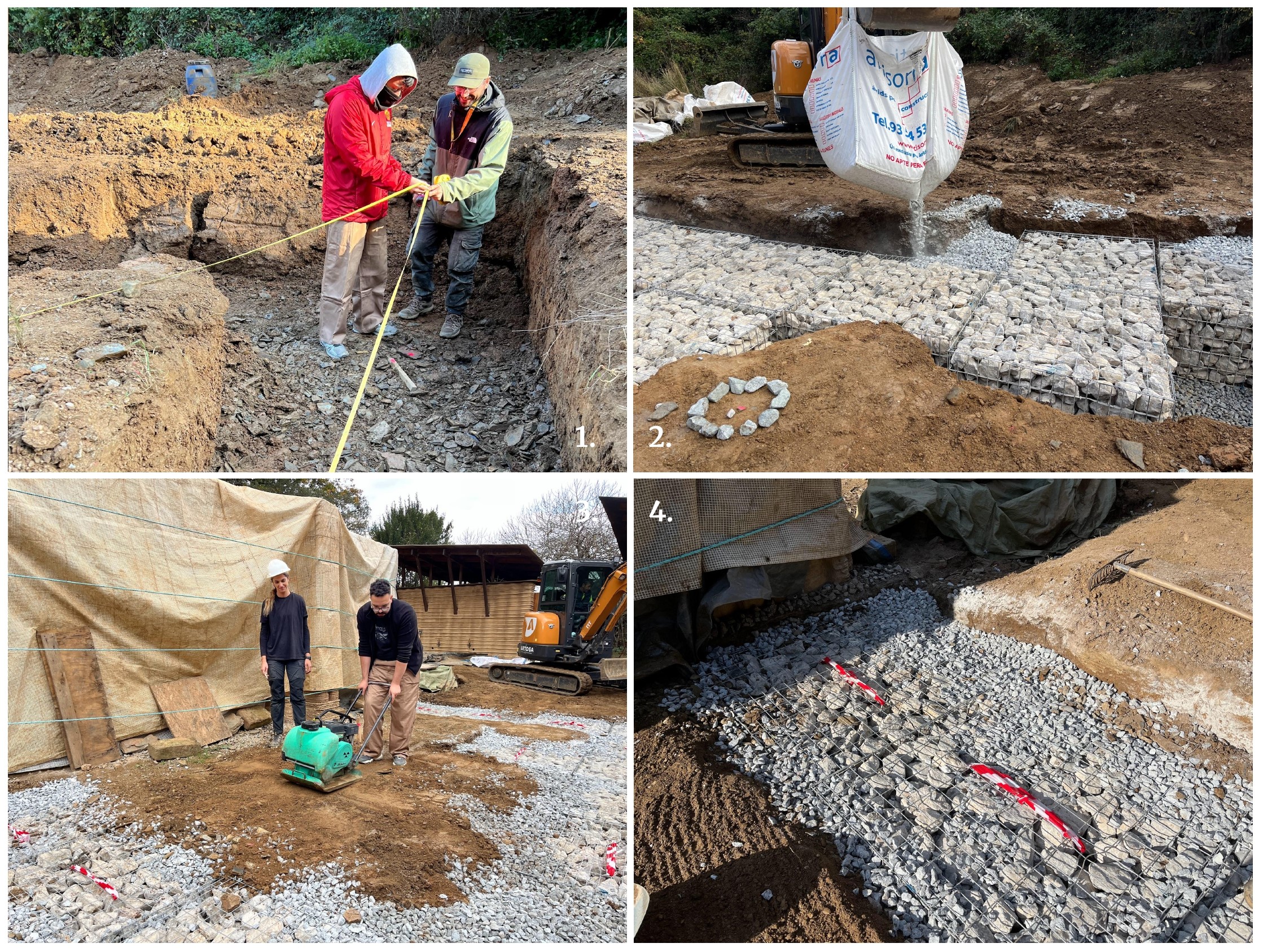 Marking and placing Gabions. Filling remaining cavities with gravel. Compacting the earth. Marking the wire connections.