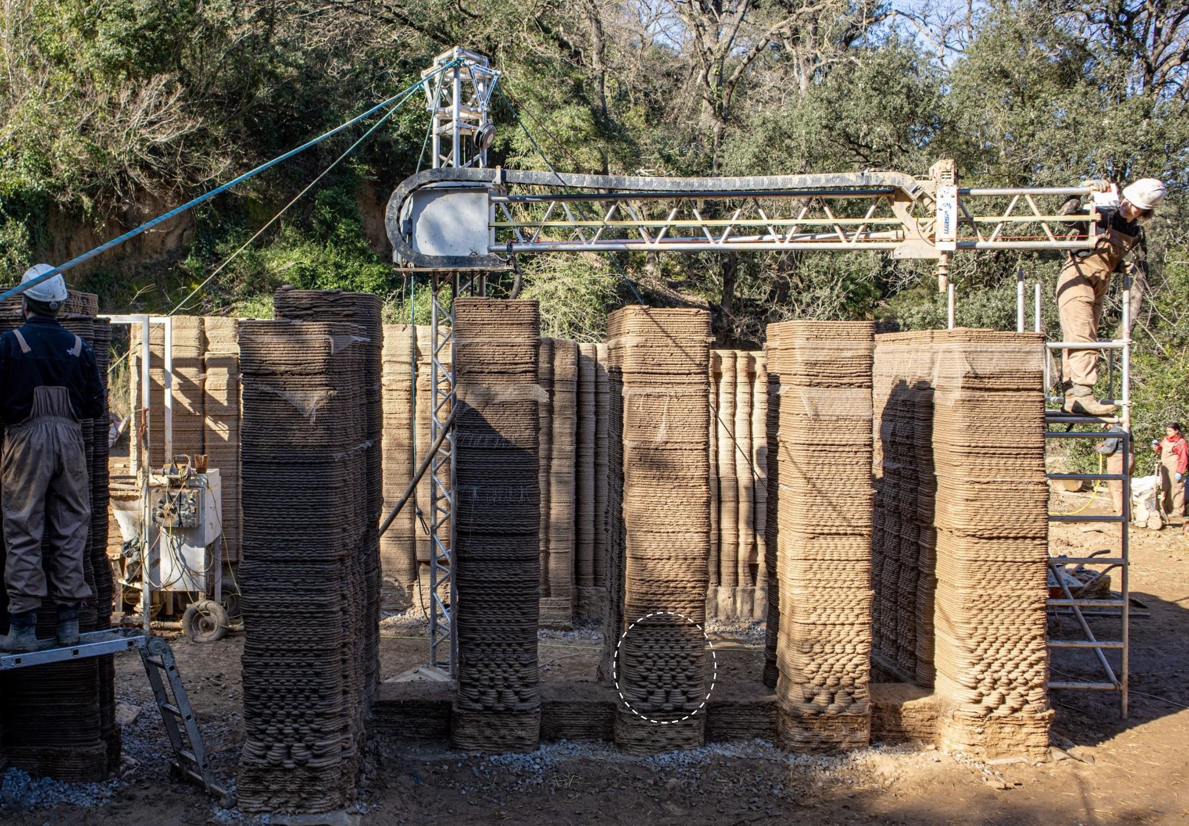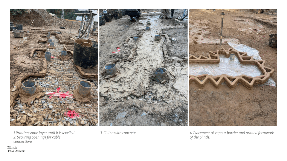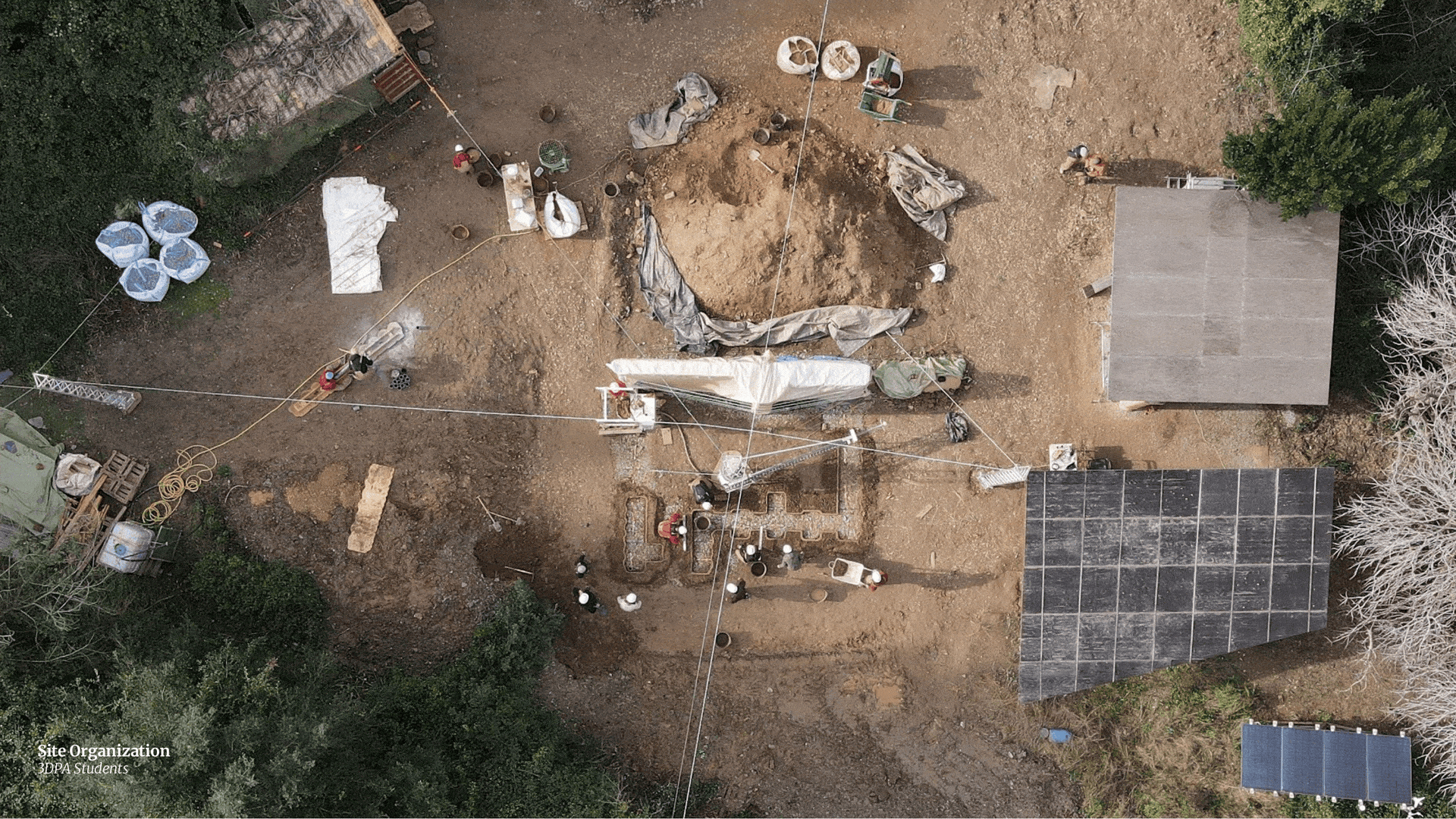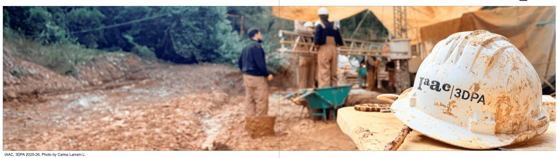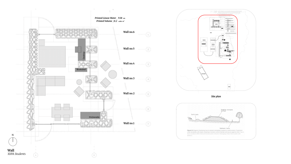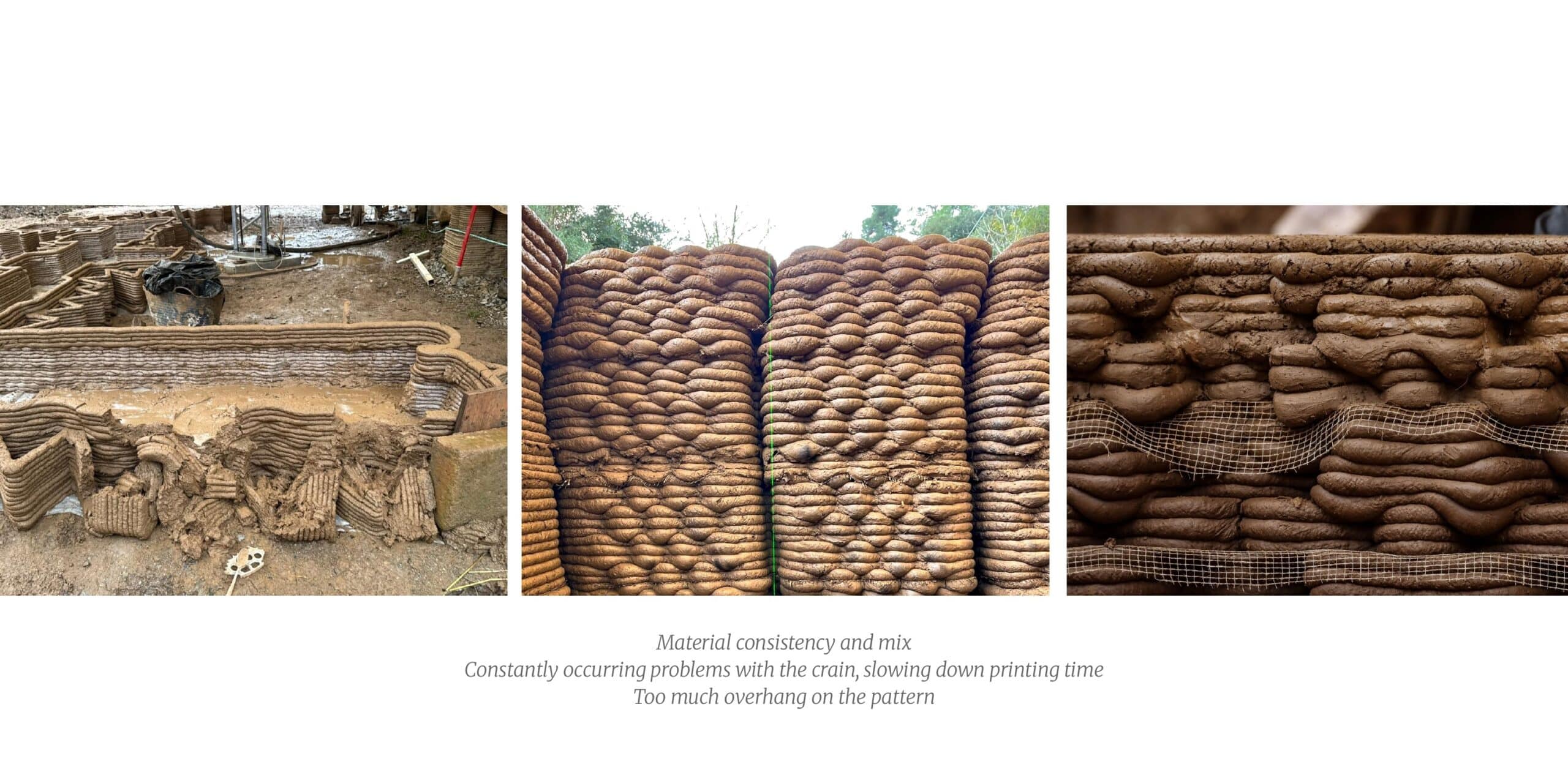 Environmental protection strategies were integrated into the site layout to address the sensitivity of earthen material during its wet state. Dedicated tarp support posts were positioned around the printing area to allow rapid deployment of protective covers in the event of rain, safeguarding freshly printed layers and enabling continuity of production despite changing weather conditions.