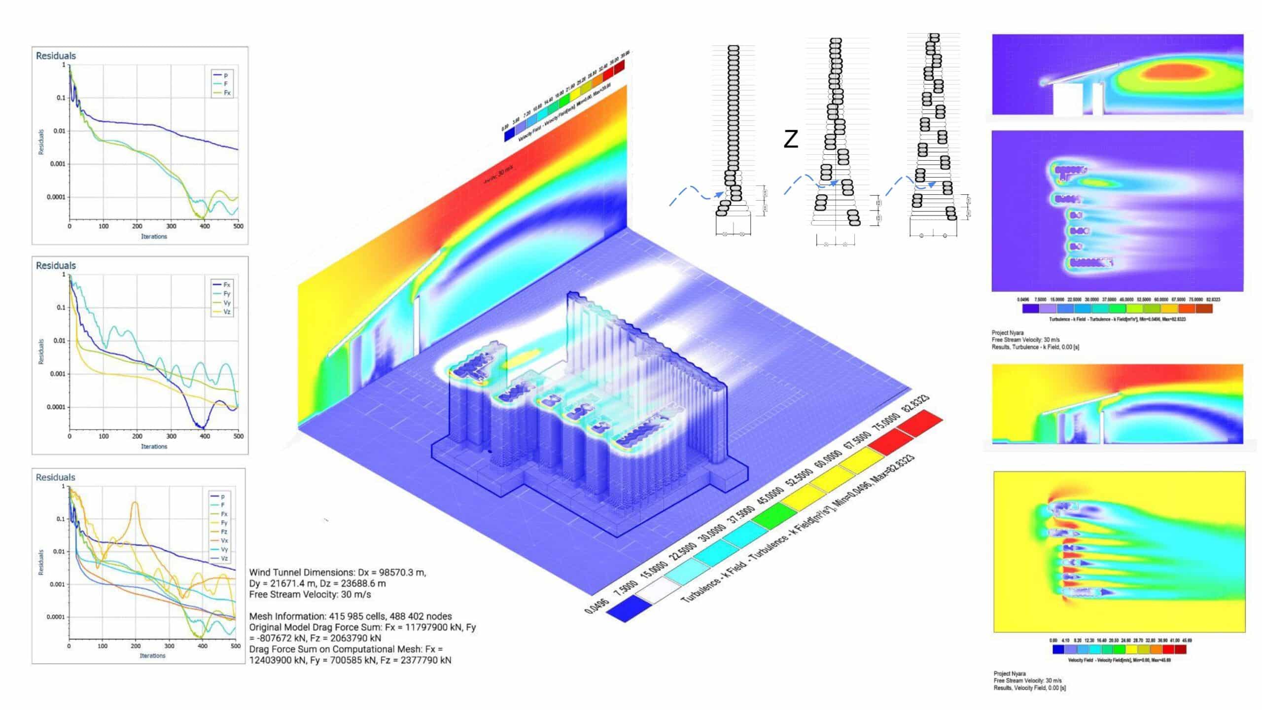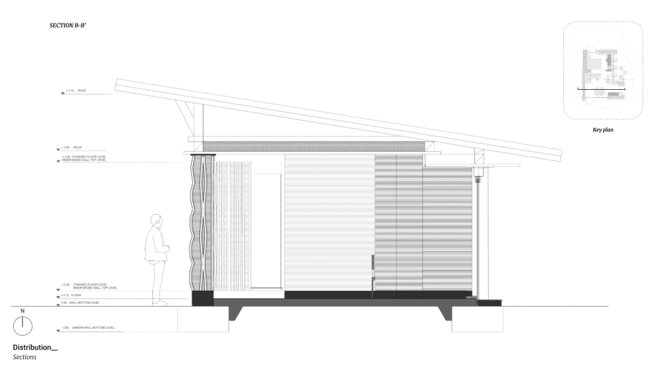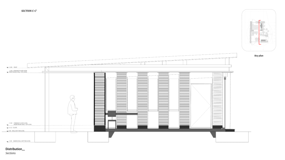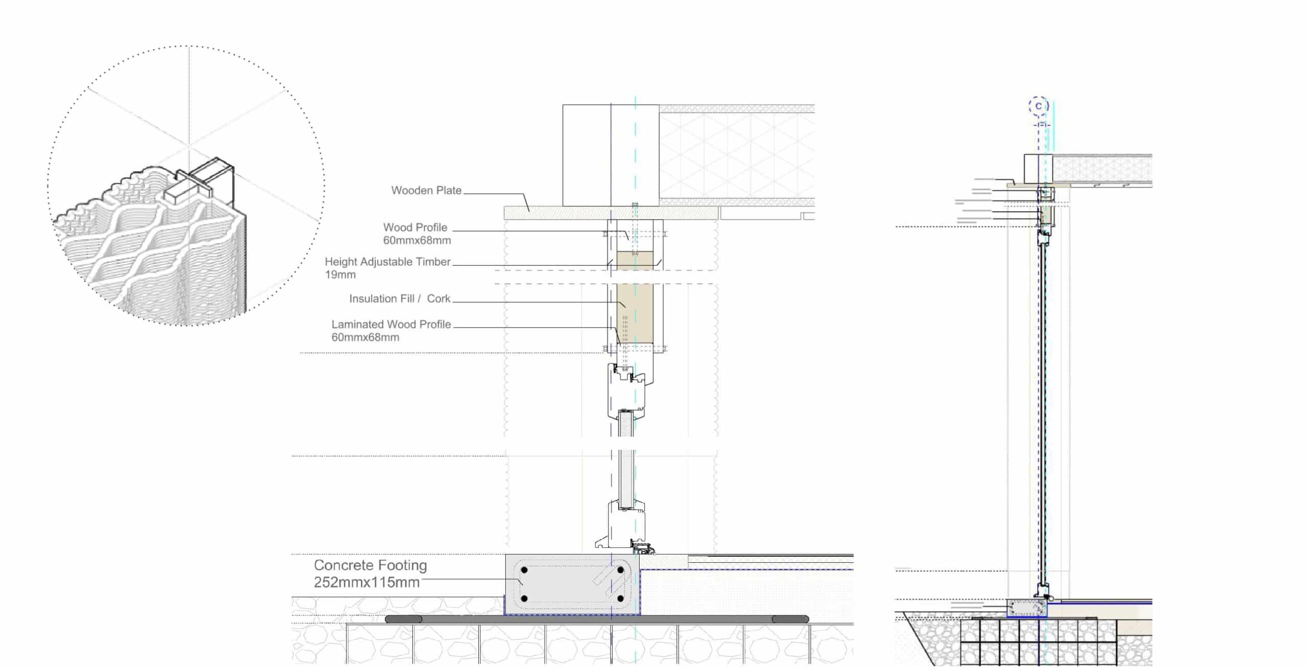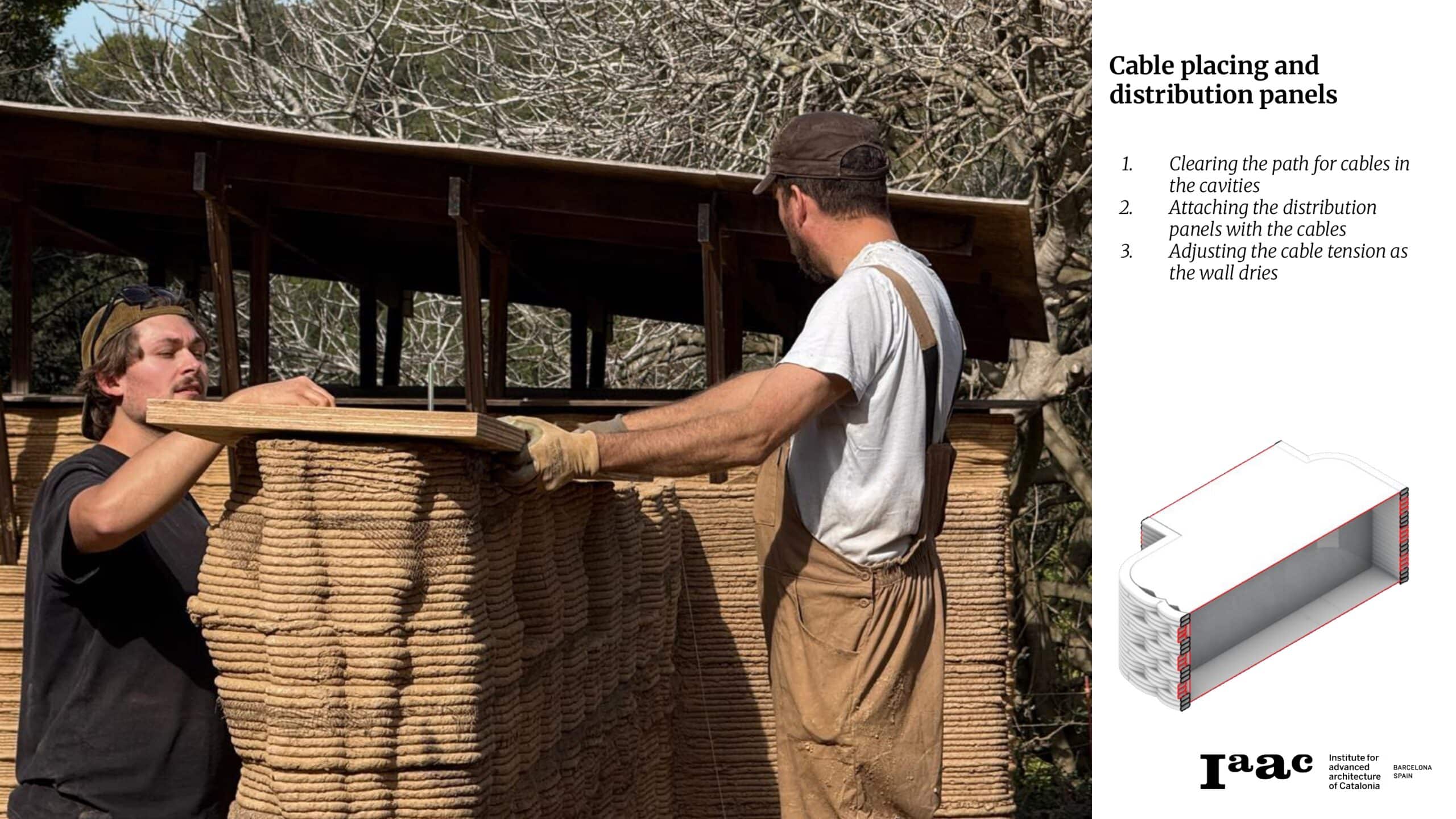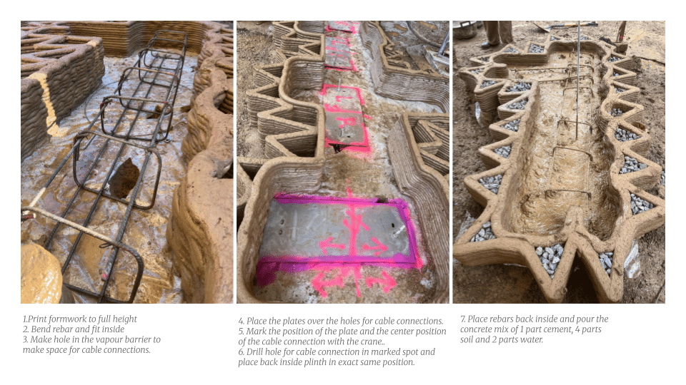 To address wind uplift and lateral forces, the roof assembly is stabilised using steel tension cables that anchor the distribution plate directly to the foundation system. These cables are fixed to the gabions at the plinth level and are guided through dedicated cavities within the earthen walls. The cavities were intentionally designed as part of the wall geometry, allowing the anchoring system to be fully integrated within the printed structure rather than applied as an external or post-added solution.