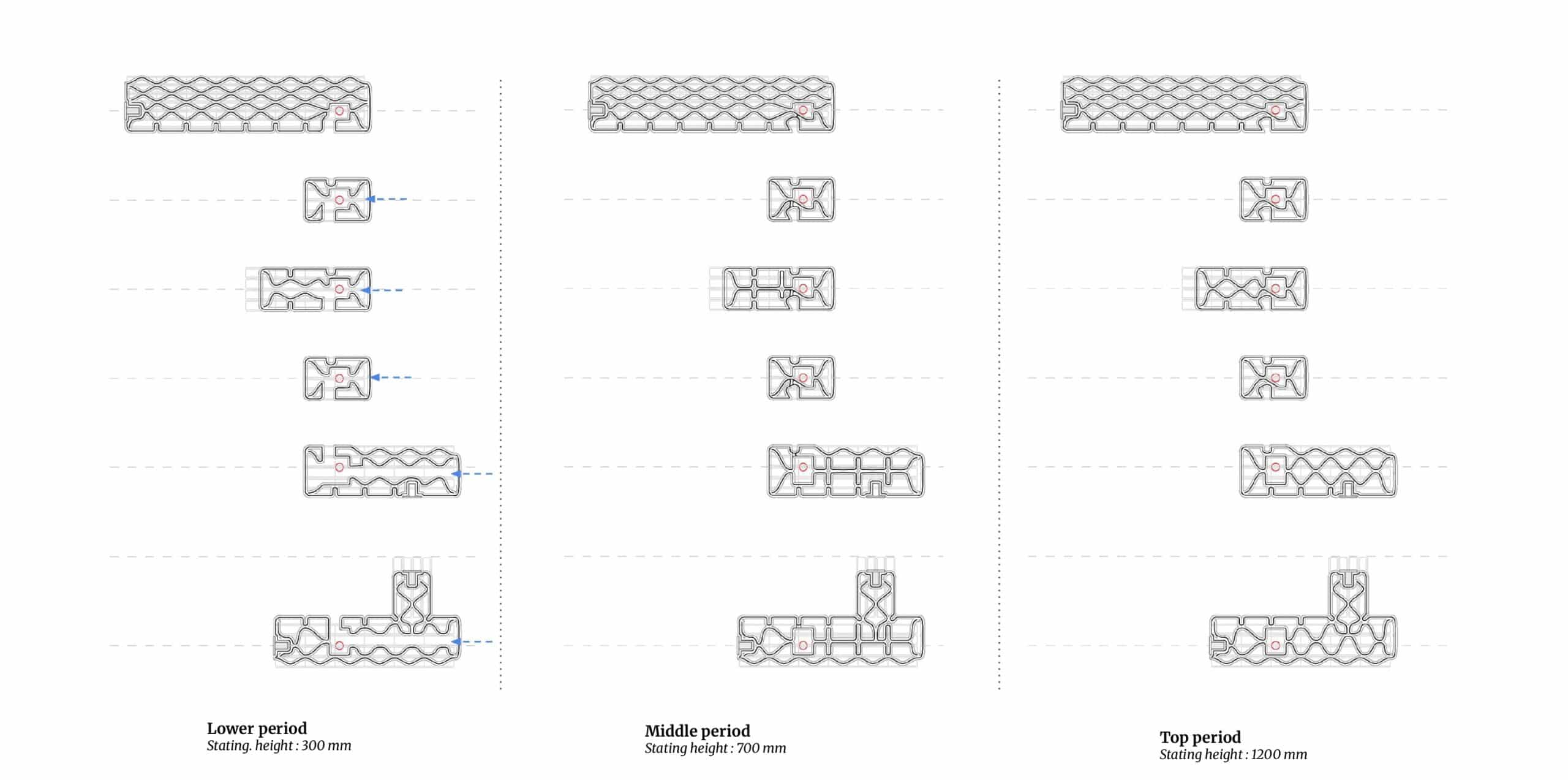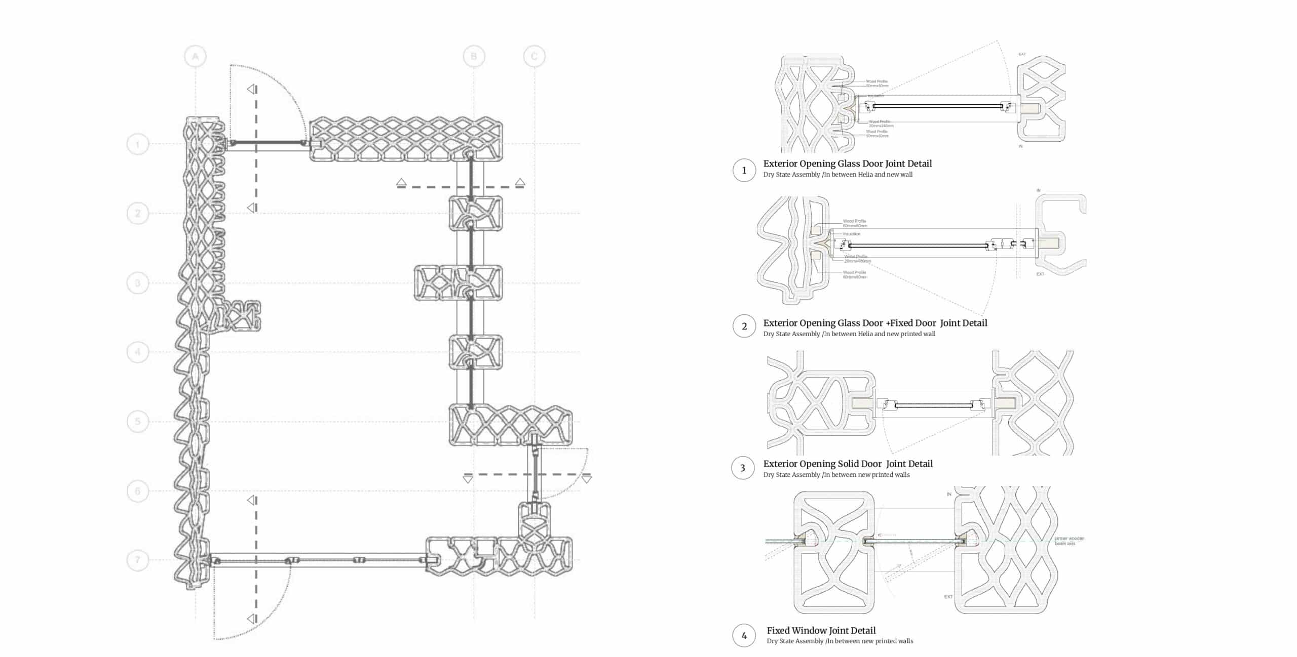 Openings are deliberately differentiated in scale and placement according to orientation and programmatic needs. Larger apertures are introduced in the living areas to enhance daylight access and spatial permeability, while smaller, more controlled openings serve private or service spaces, balancing enclosure, privacy, and environmental performance. The layout therefore operates both as a domestic plan and as a testbed for evaluating how discrete printed wall systems, informed by material behaviour and fabrication logic, can be composed into a complete inhabitable structure.