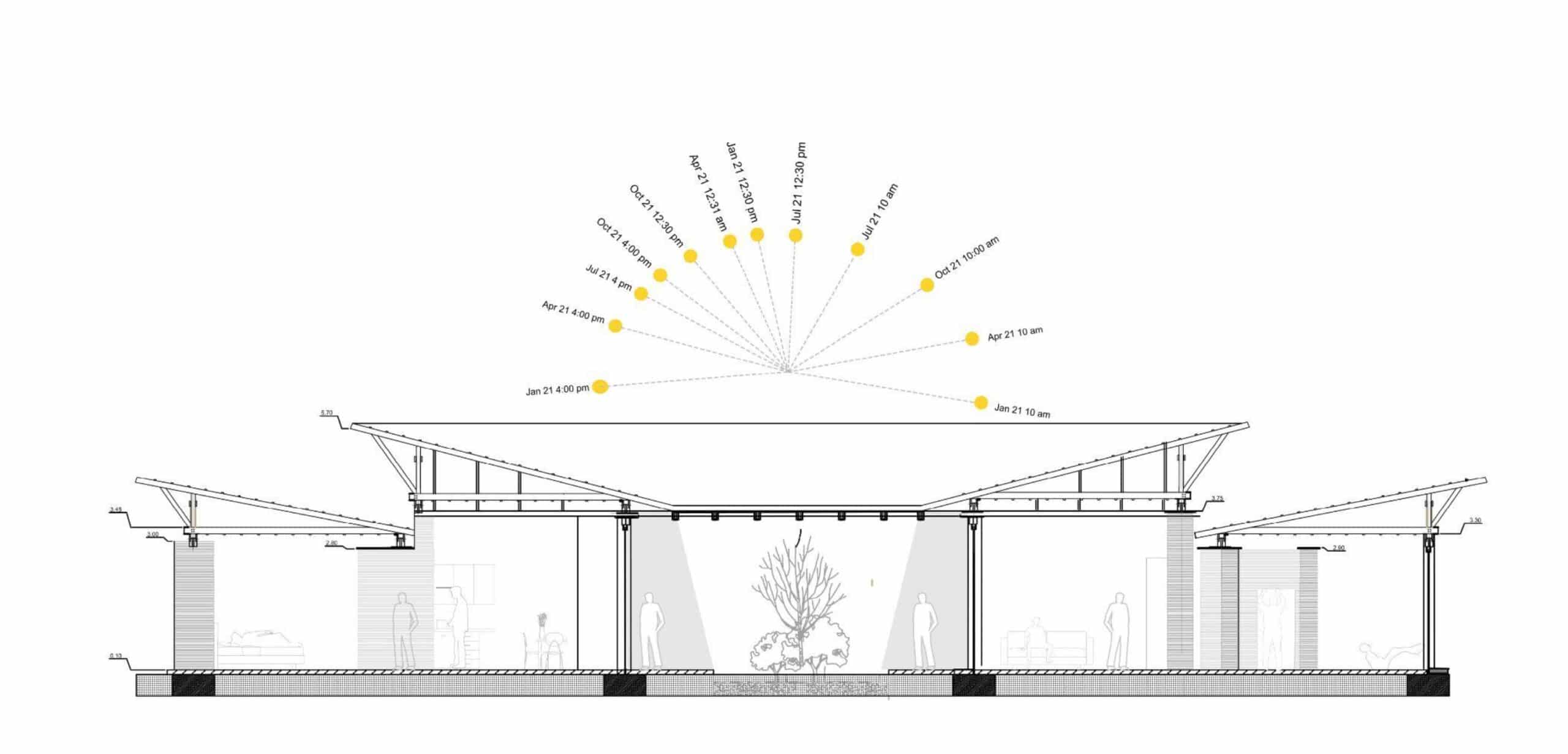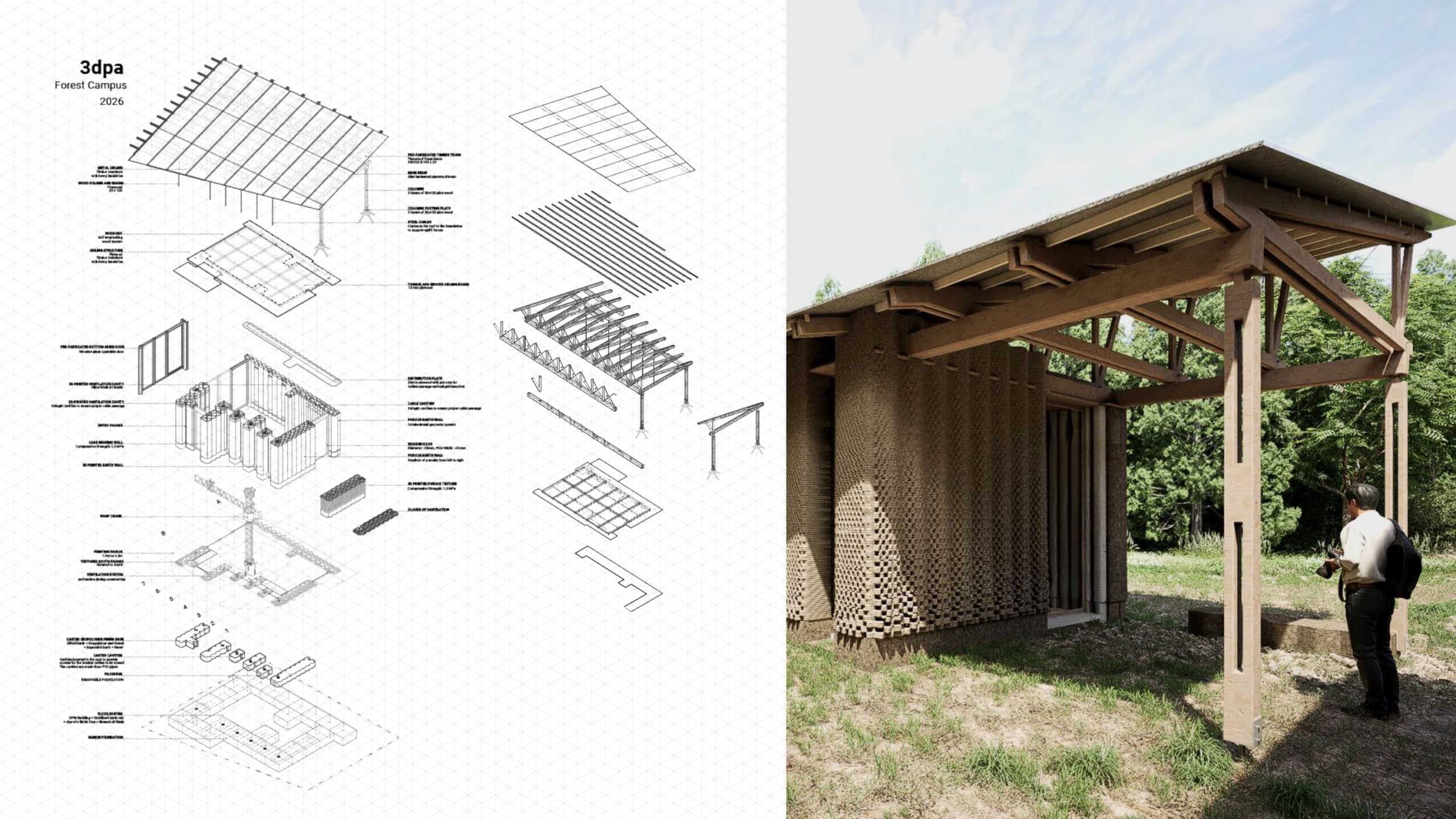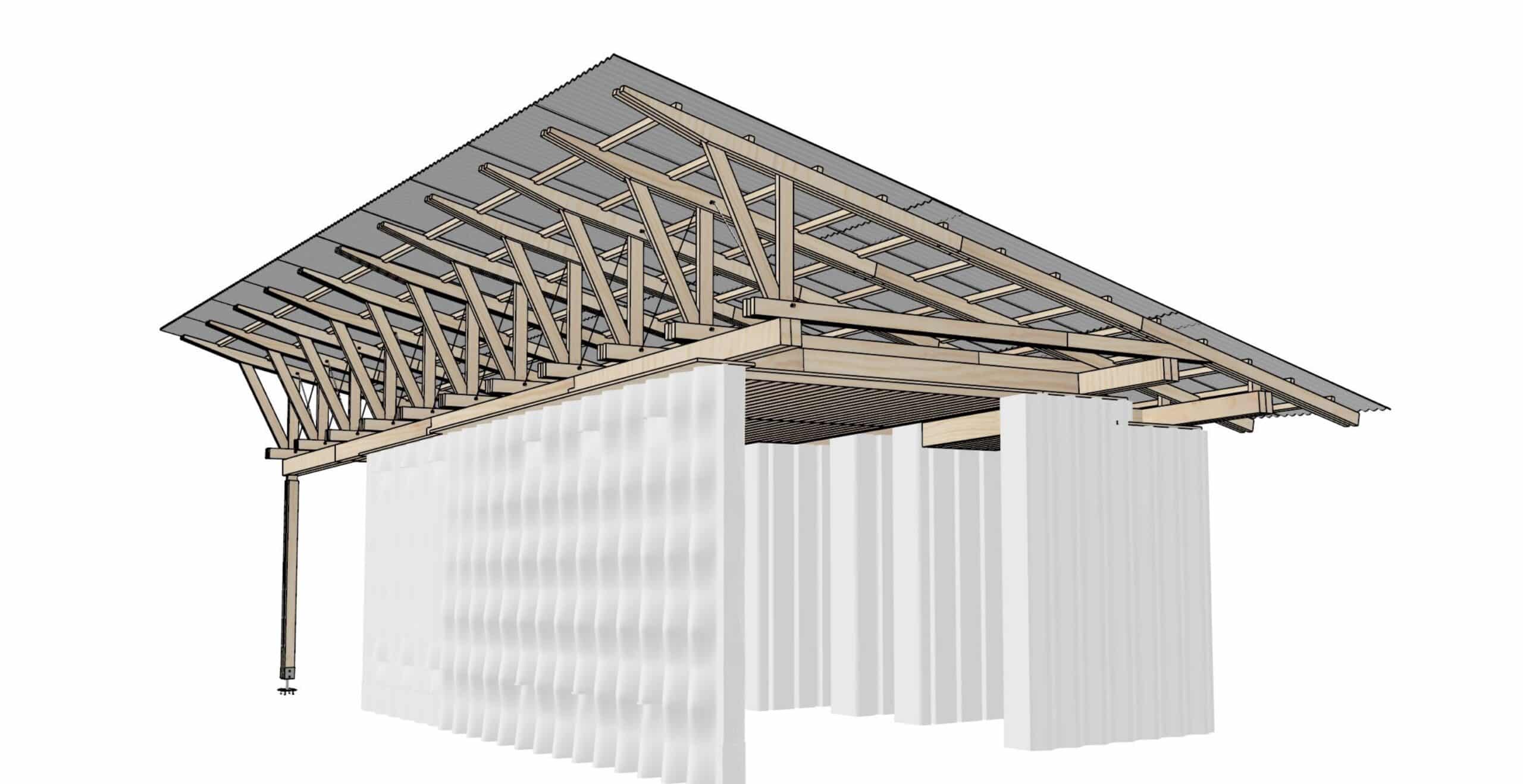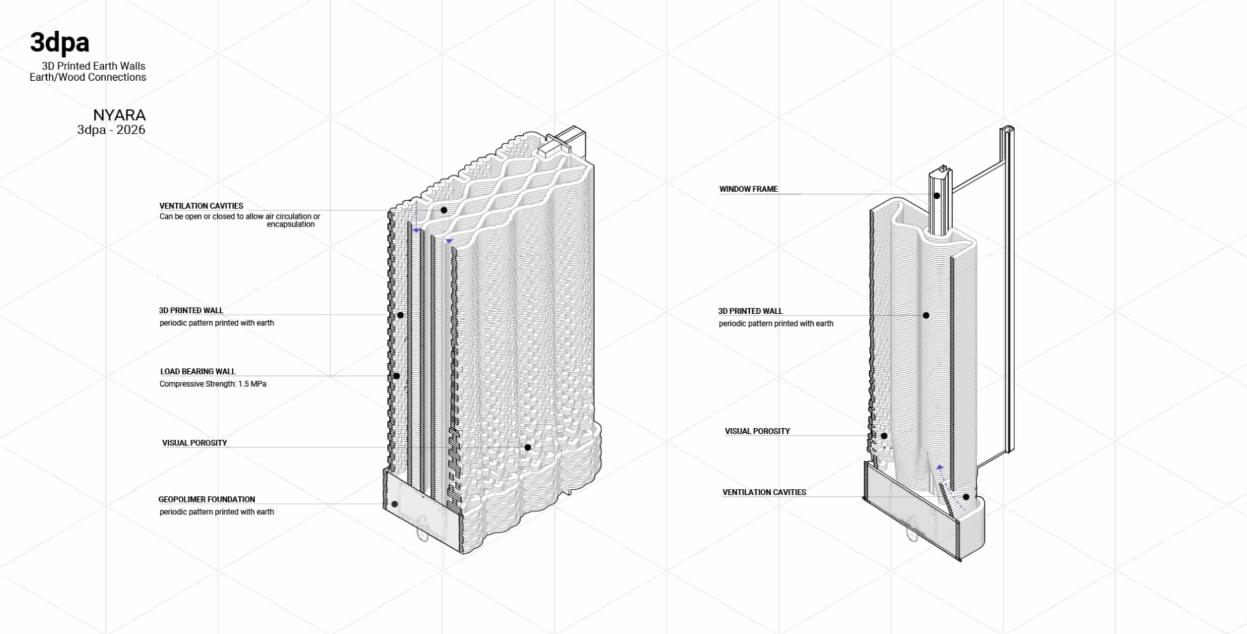 Through this approach, the roof is not treated as an isolated element but as part of a continuous structural system, linking foundation, wall geometry, and enclosure. The resulting assembly demonstrates how lightweight timber construction can be effectively combined with 3D-printed earthen walls while maintaining structural coherence, adaptability, and fabrication-aware detailing.