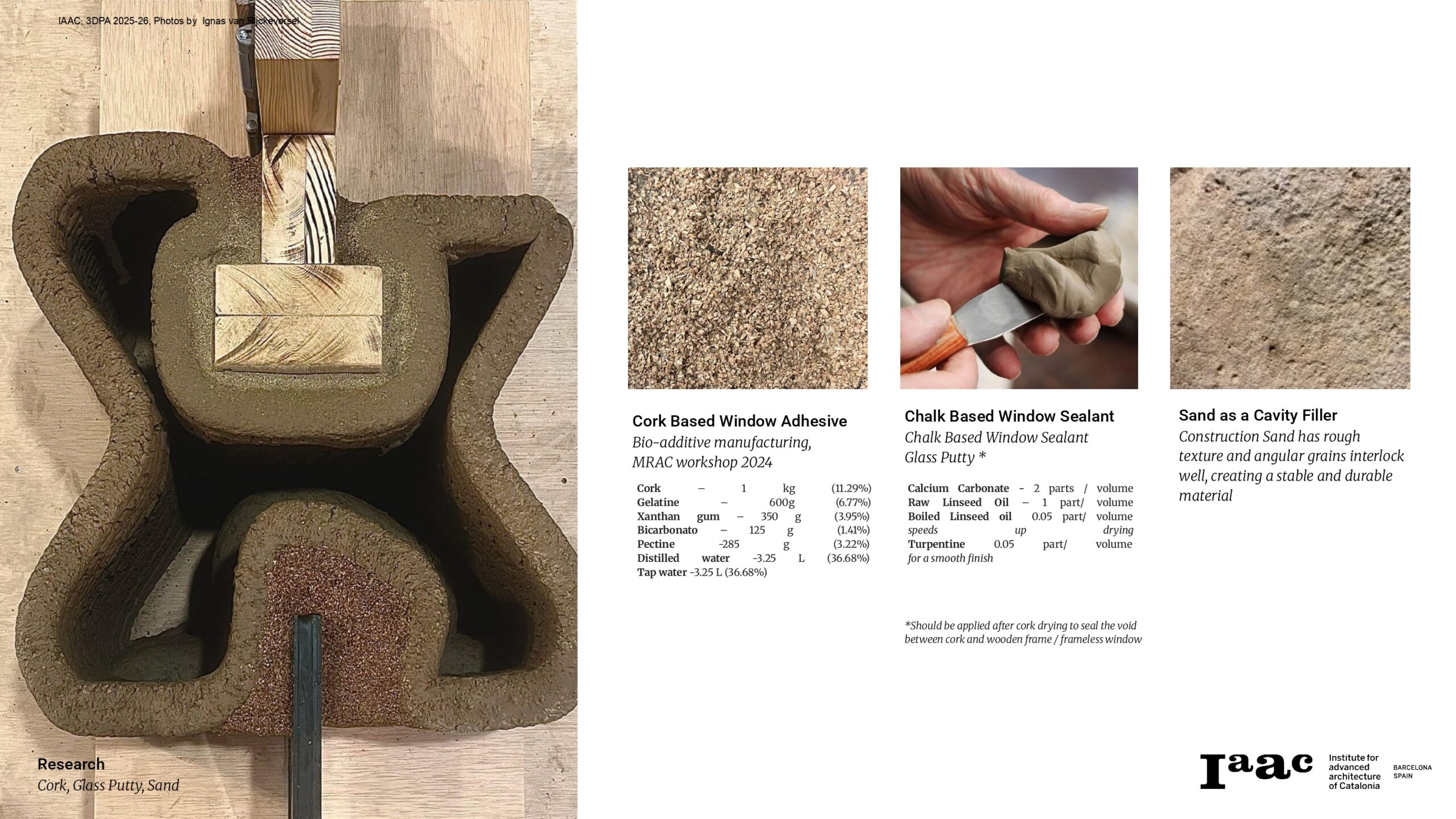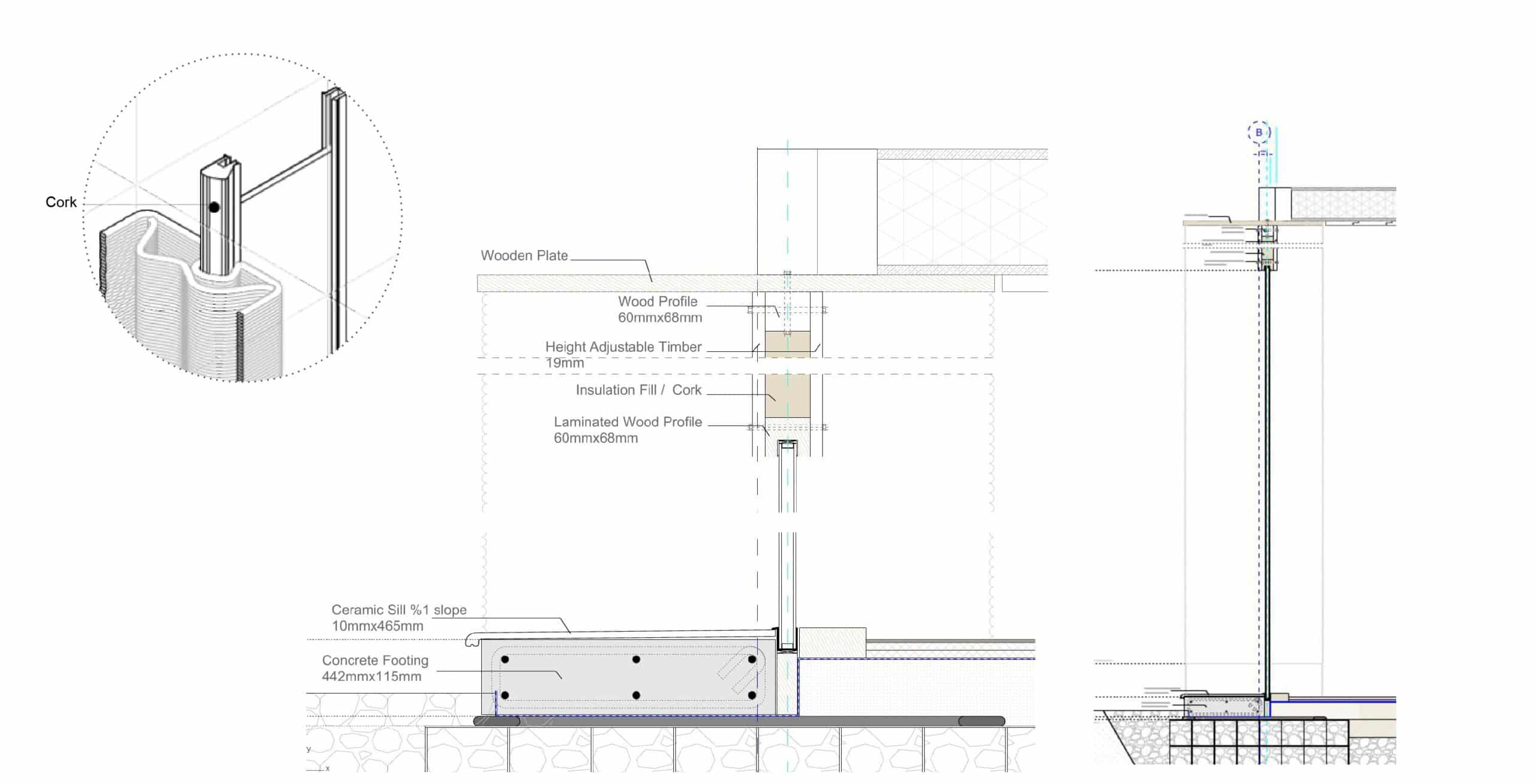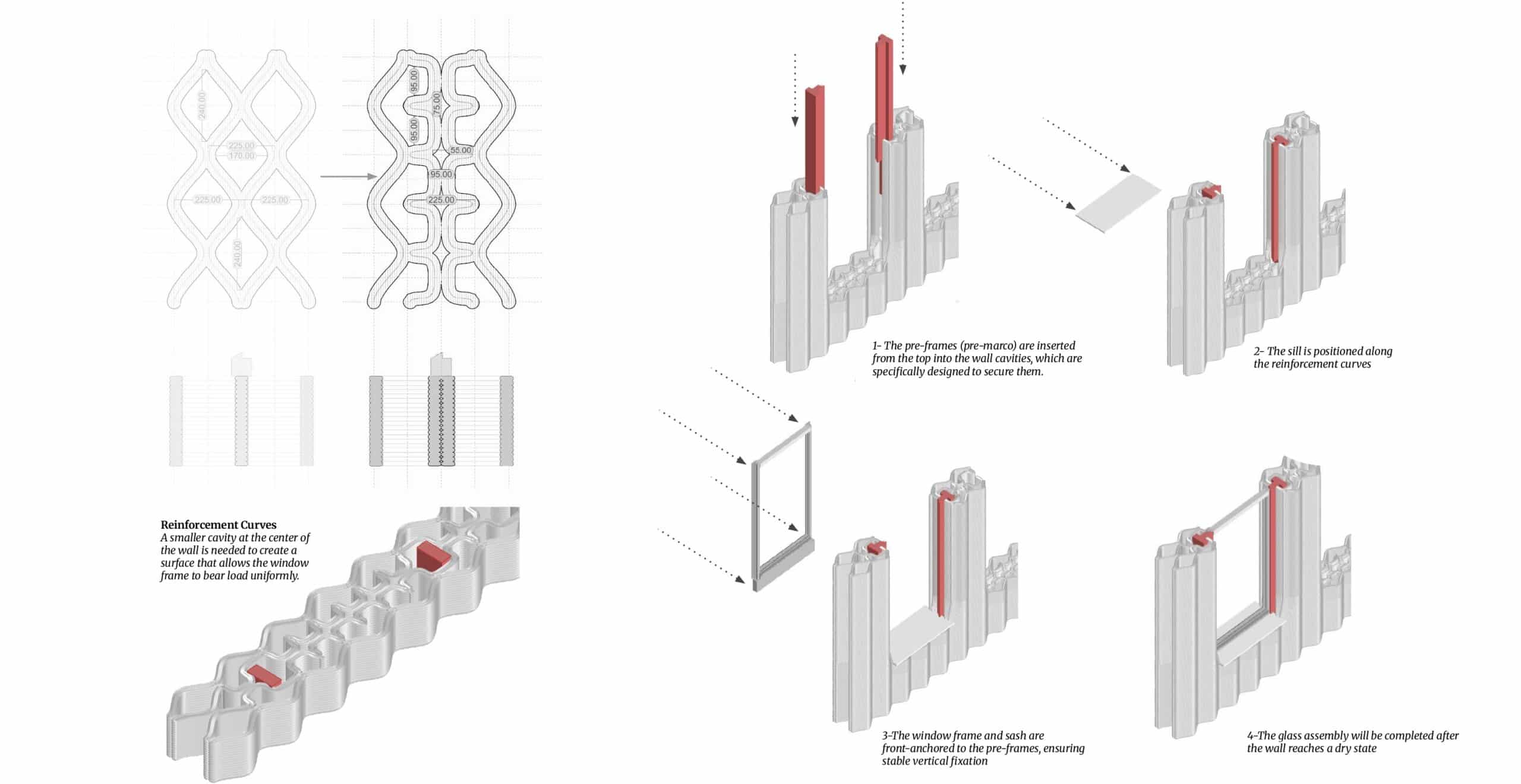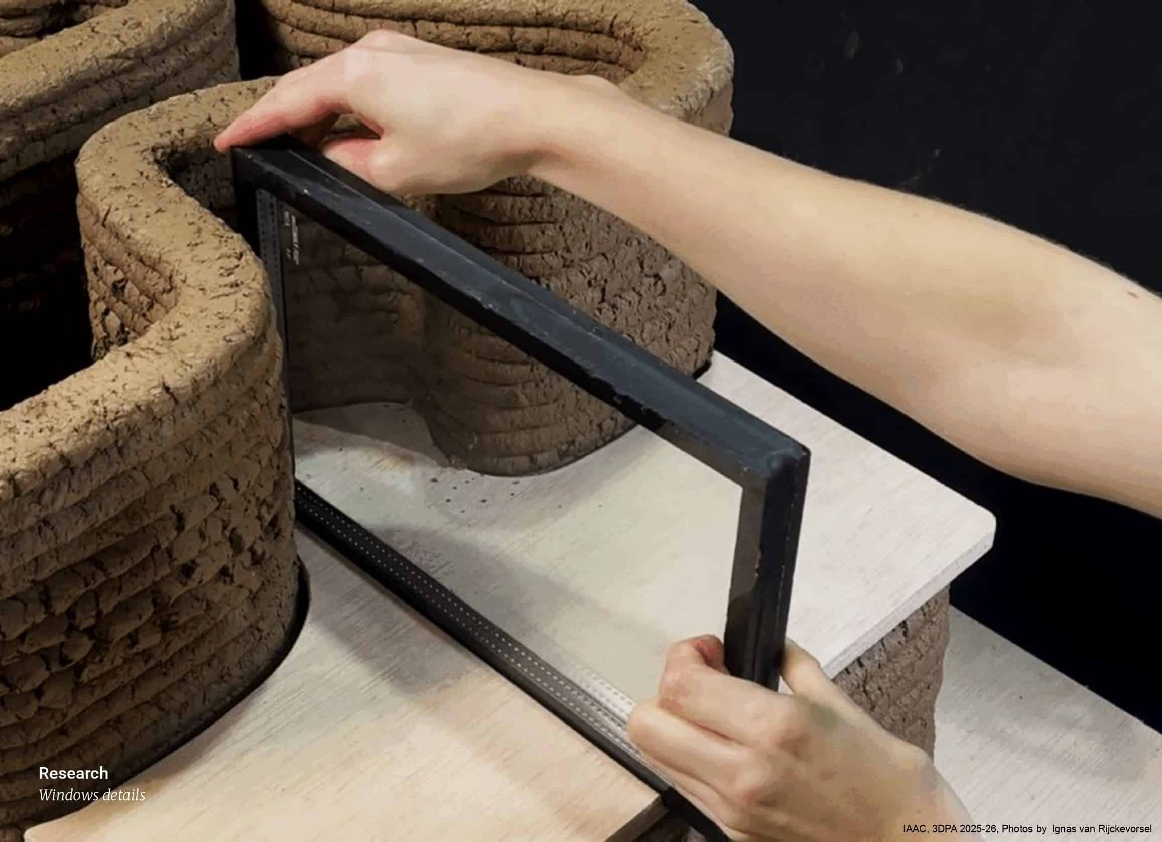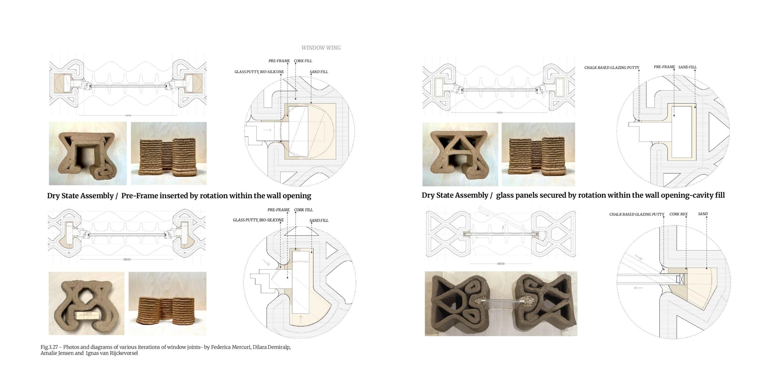 This study proposes a flexible, post-print joinery system for integrating standard windows into 3D-printed earthen walls. Using internal cavities and a wooden pre-frame filled with sand or cork, it ensures structural stability, airtightness, and easy future replacement—bridging traditional components with earthen material behavior.