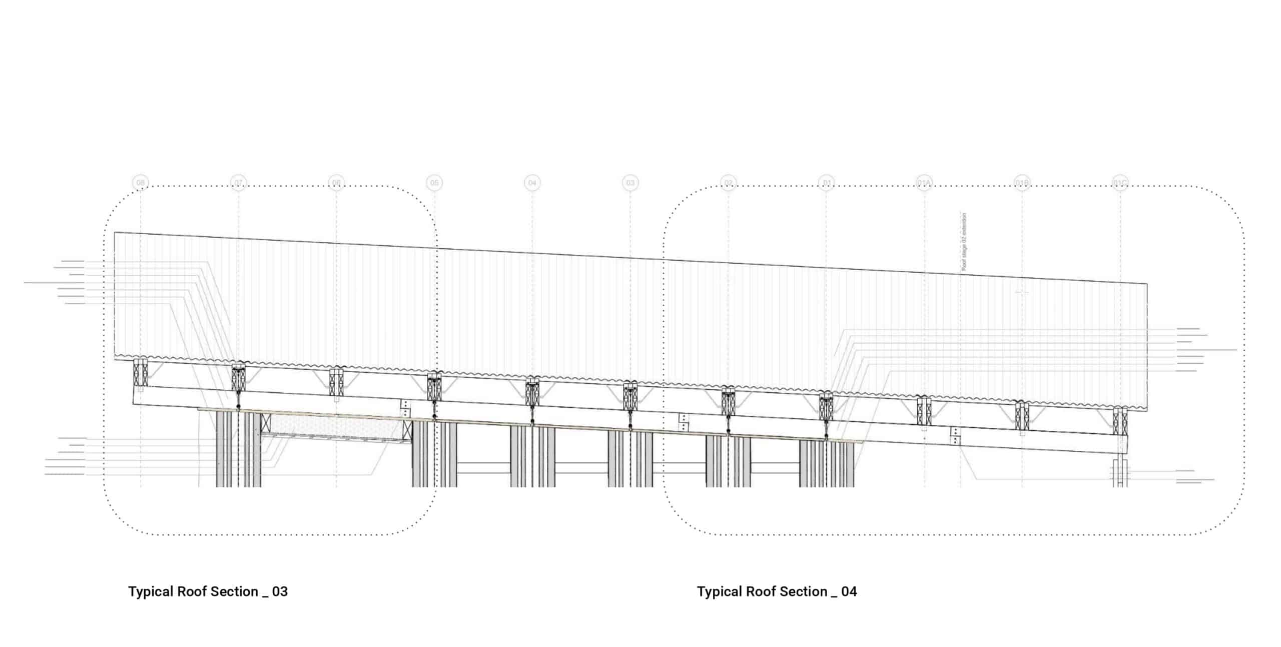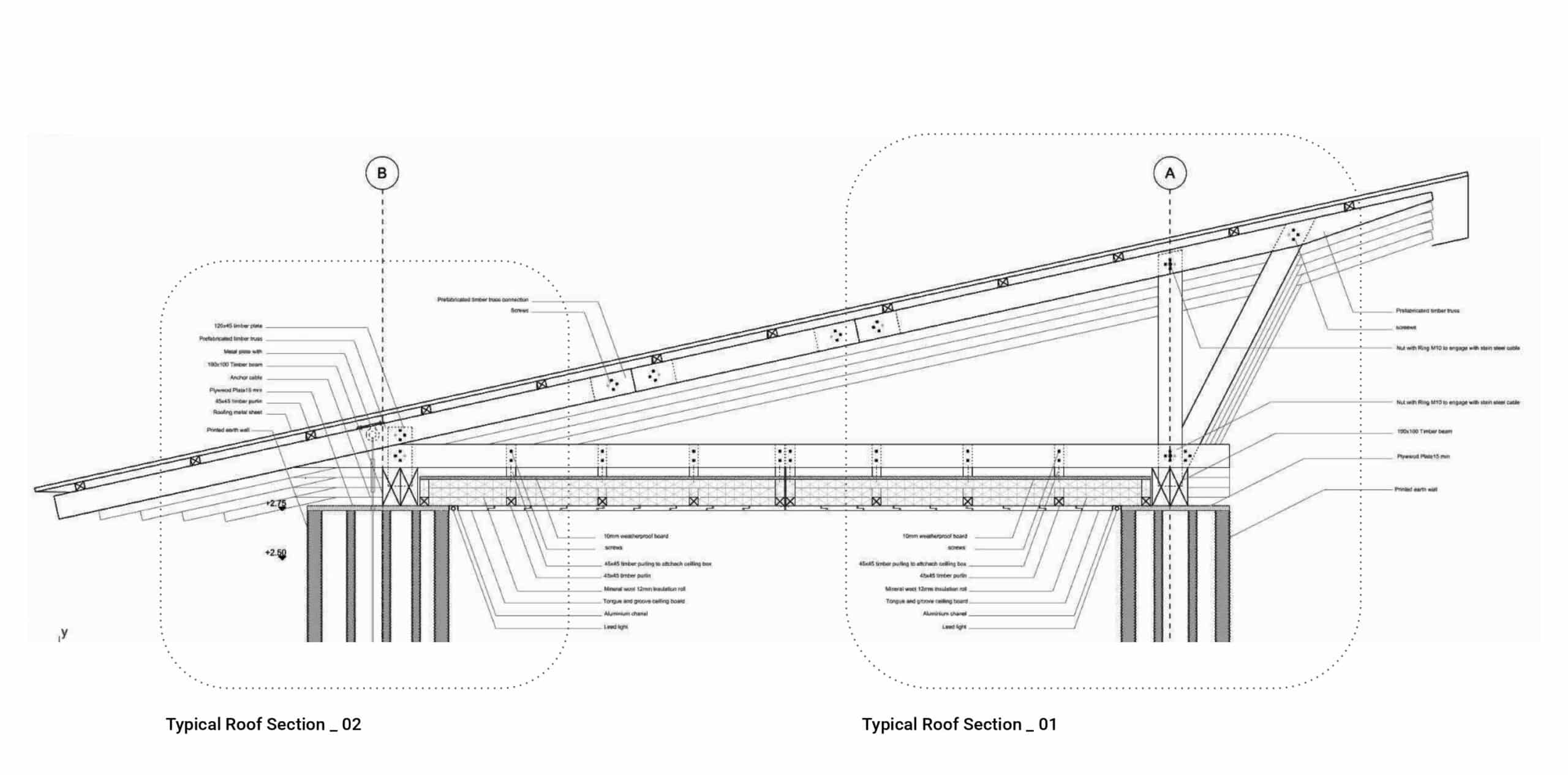 The roof system is conceived as an entirely timber-based assembly, designed to remain lightweight while providing structural stability and climatic protection for the earthen enclosure. A network of wooden beams forms the primary load-bearing structure, spanning over the printed walls and allowing loads to be distributed efficiently without over-stressing the earthen material, particularly during early drying stages.