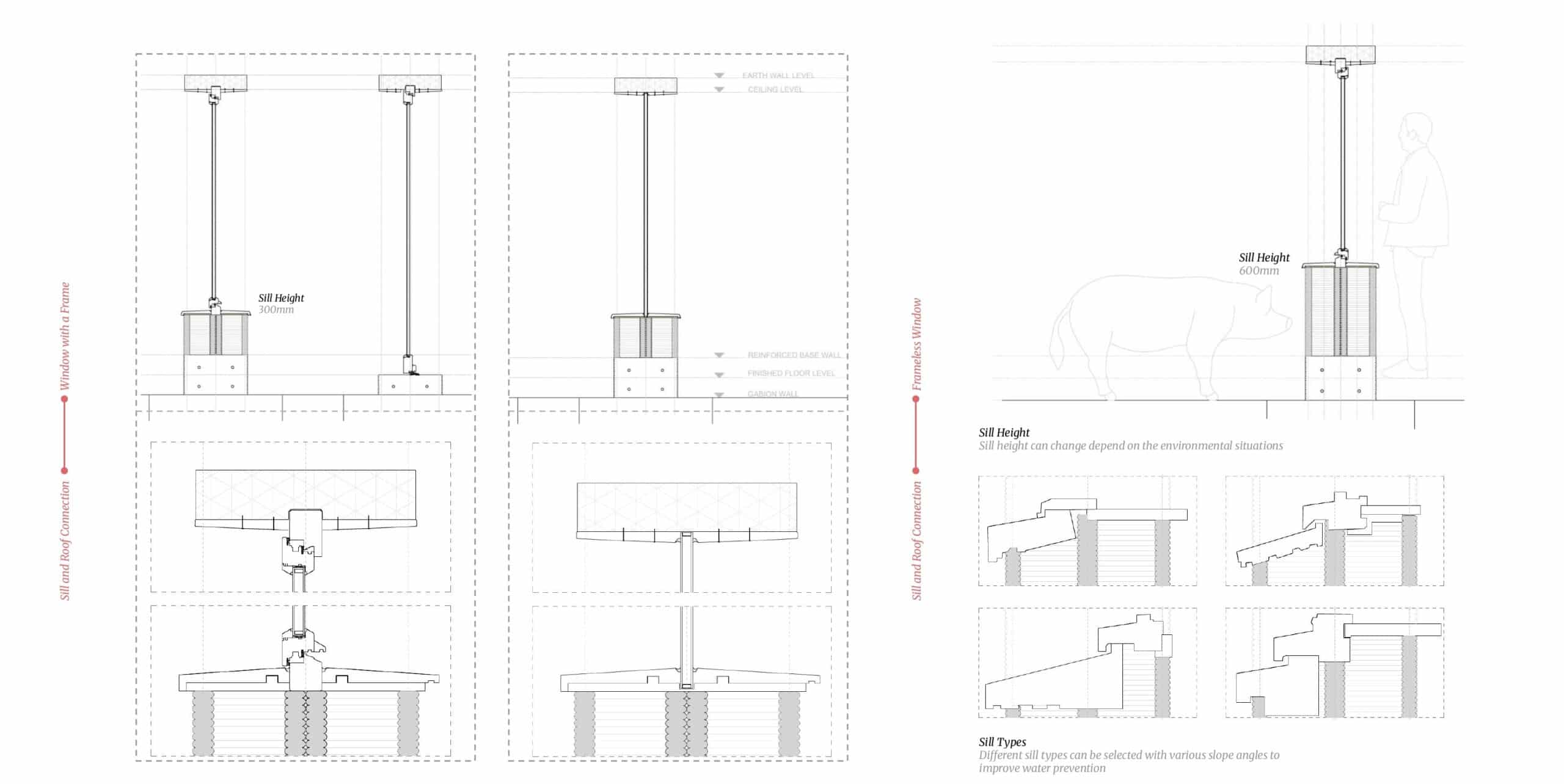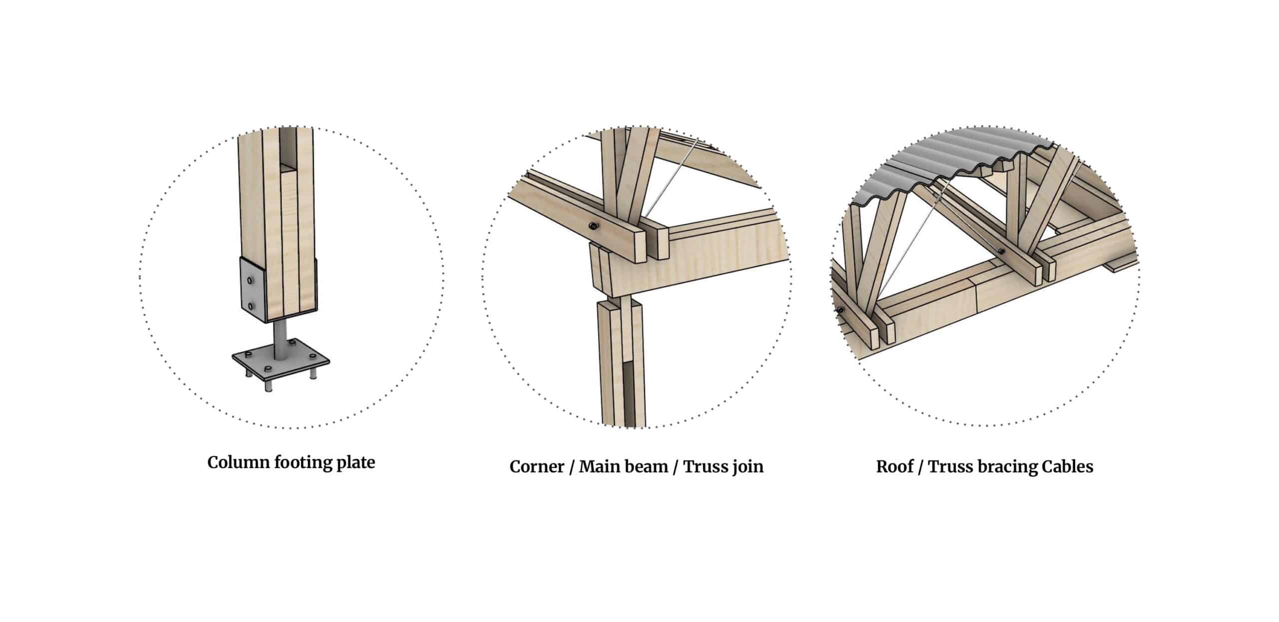 At the interface between the roof and the walls, a continuous timber distribution plate is introduced. This element plays a critical role in mediating between the geometric tolerances of the 3D-printed earth and the precision required for timber construction. It ensures even load transfer, accommodates minor surface irregularities, and provides a clear, repeatable connection strategy between enclosure and roof.