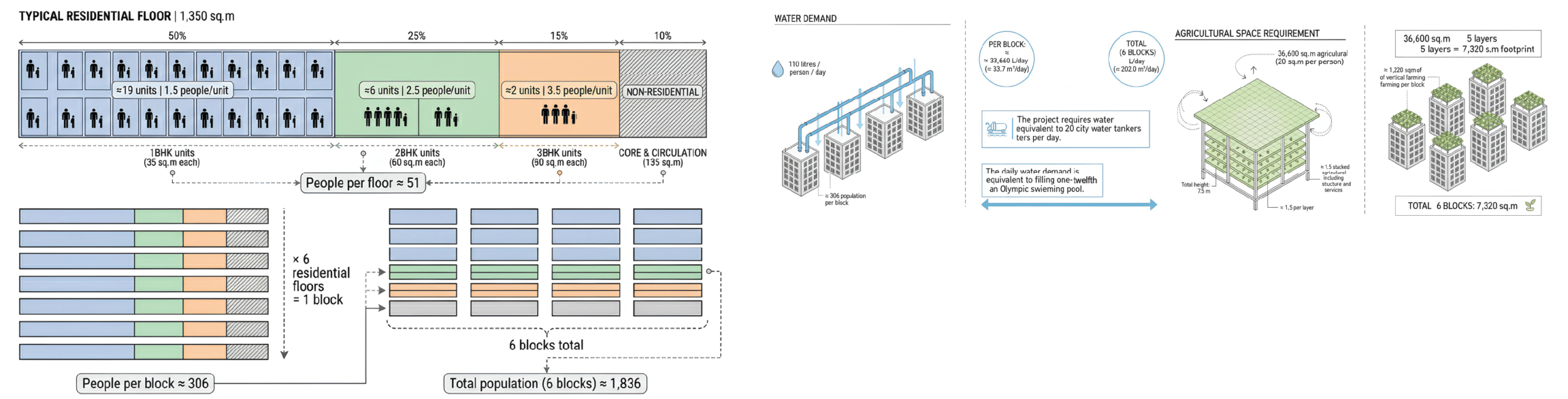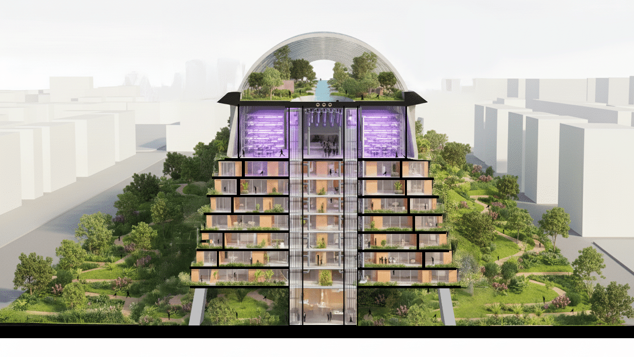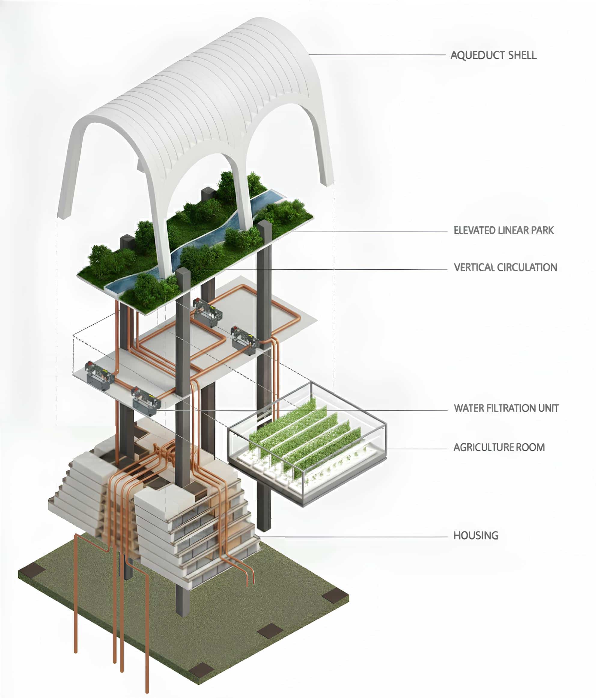 The programmatic stratification of the Aqueduct Project, reimagining historical infrastructure as a living machine. Crowning the structure is the Aqueduct Shell, a monumental arched enclosure that shelters the Elevated Linear Park, creating a shaded public promenade centered around water conveyance. Water Filtration Units are integrated directly into the structural spine, visible through a network of distribution piping that feeds the cantilevered Agriculture Room, a hydroponic greenhouse ensuring local food production. Anchoring the base is the high-density Housing module, which benefits from the purified water and agricultural yields above, connected vertically by a central Vertical Circulation core.
