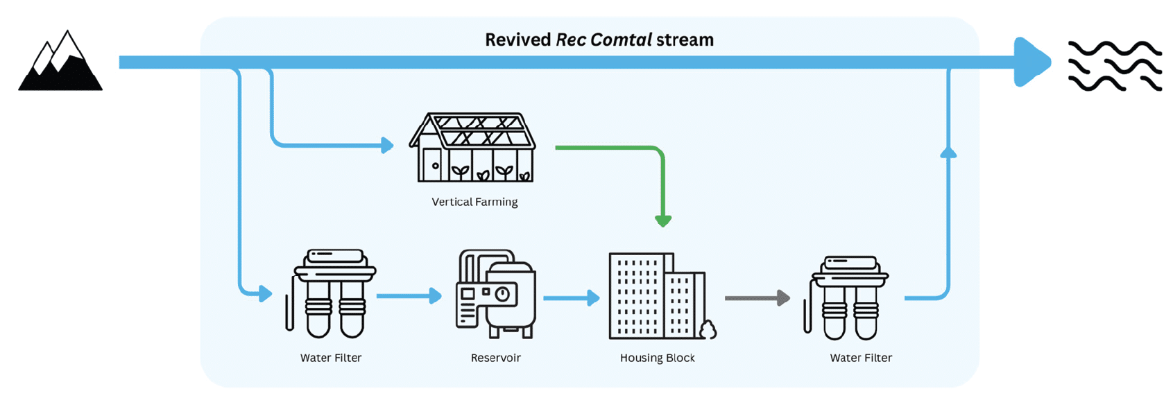 We will implement a closed and self-sucient water loop that begins with the stream of the Rec Comtal through the aqueduct, travels downwards into filtration systems and vertical farming for the housing. The greywater is renewed and fed back into the Rec Comtal.