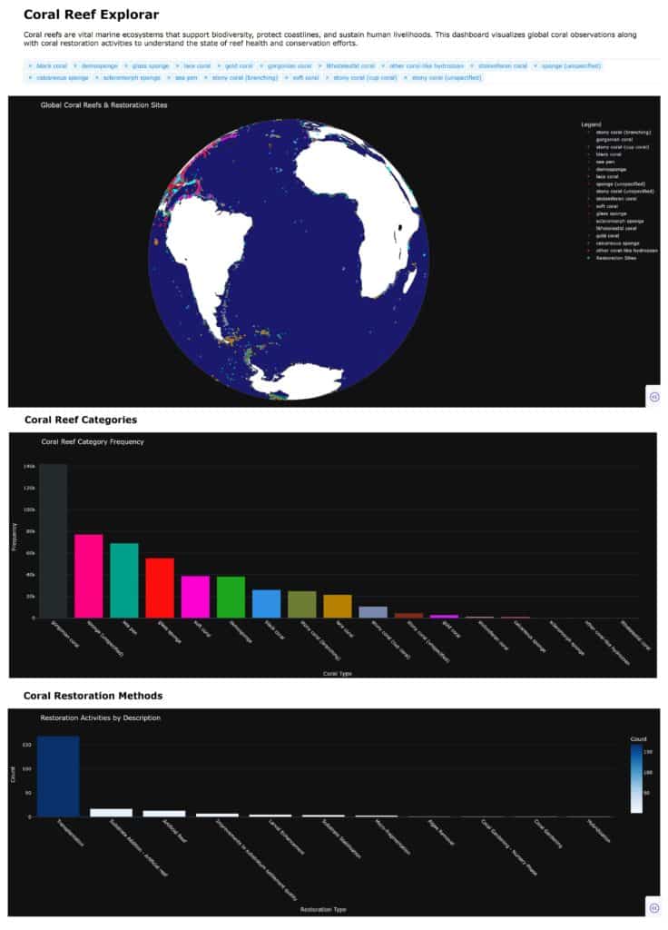 We developed the Coral Reef Explorer Dashboard—a Python-built, interactive platform that maps global coral observations alongside coral restoration activities. This dashboard brings together spatial datasets to help researchers, planners, conservationists, and the public understand the current state of coral ecosystems and the efforts underway to protect them.