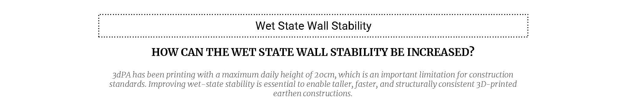 This research focuses on one of the main limitations of 3D printing with earth: low stability in the wet state. Today, the maximum daily printing height is around 20 cm, which limits construction efficiency. This project explores how to improve wet-state stability to enable taller, faster, and more consistent earthen walls.
