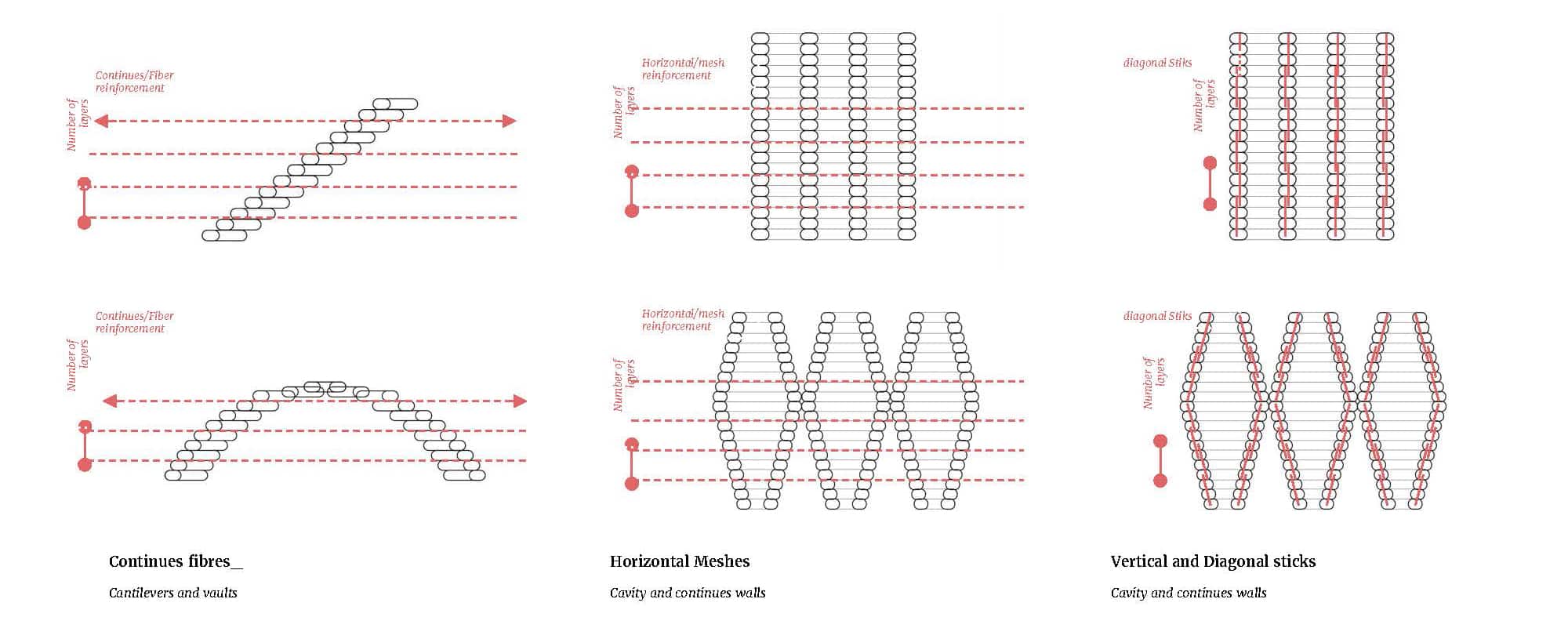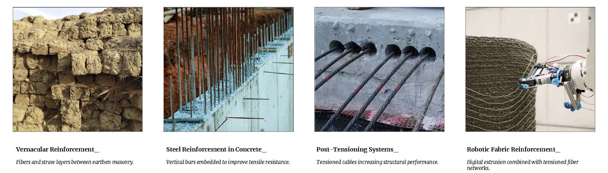 We reviewed reinforcement strategies in architecture, from vernacular techniques using natural fibers to contemporary systems such as vertical steel bars and post-tensioned cables. These precedents show how reinforcement elements can significantly improve structural performance, even in early material stages.