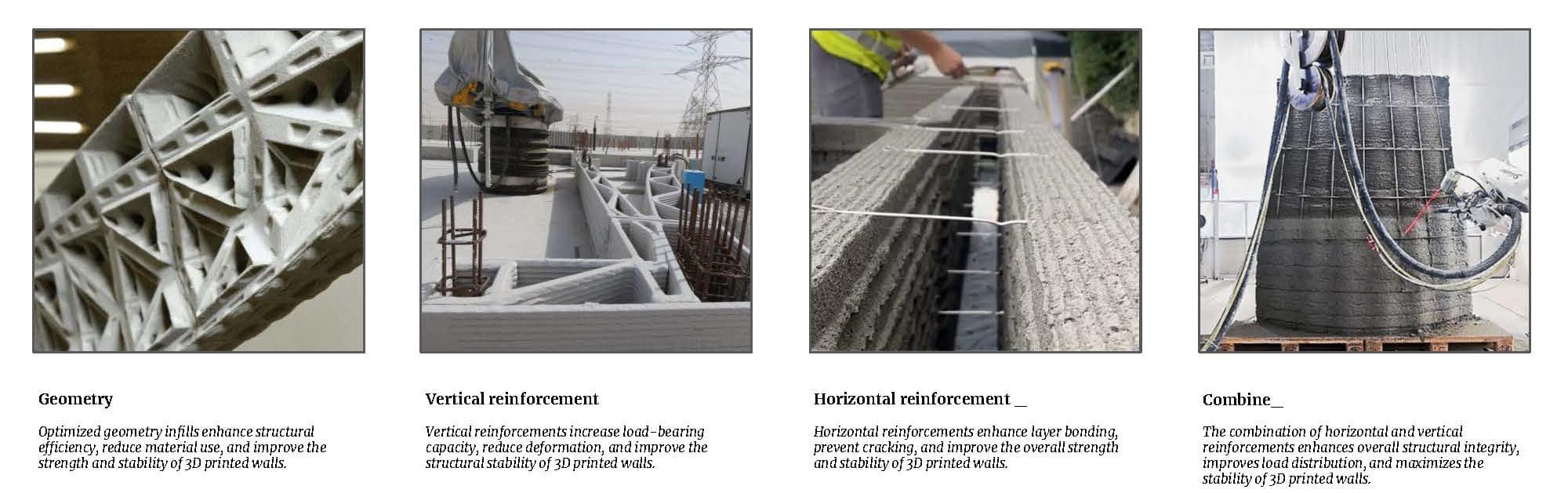 Four main reinforcement strategies are used in 3D printing today: optimized geometry patterns, vertical reinforcements, horizontal reinforcements, and combined systems. Each method affects wall stability in different ways and influences the achievable printing height.