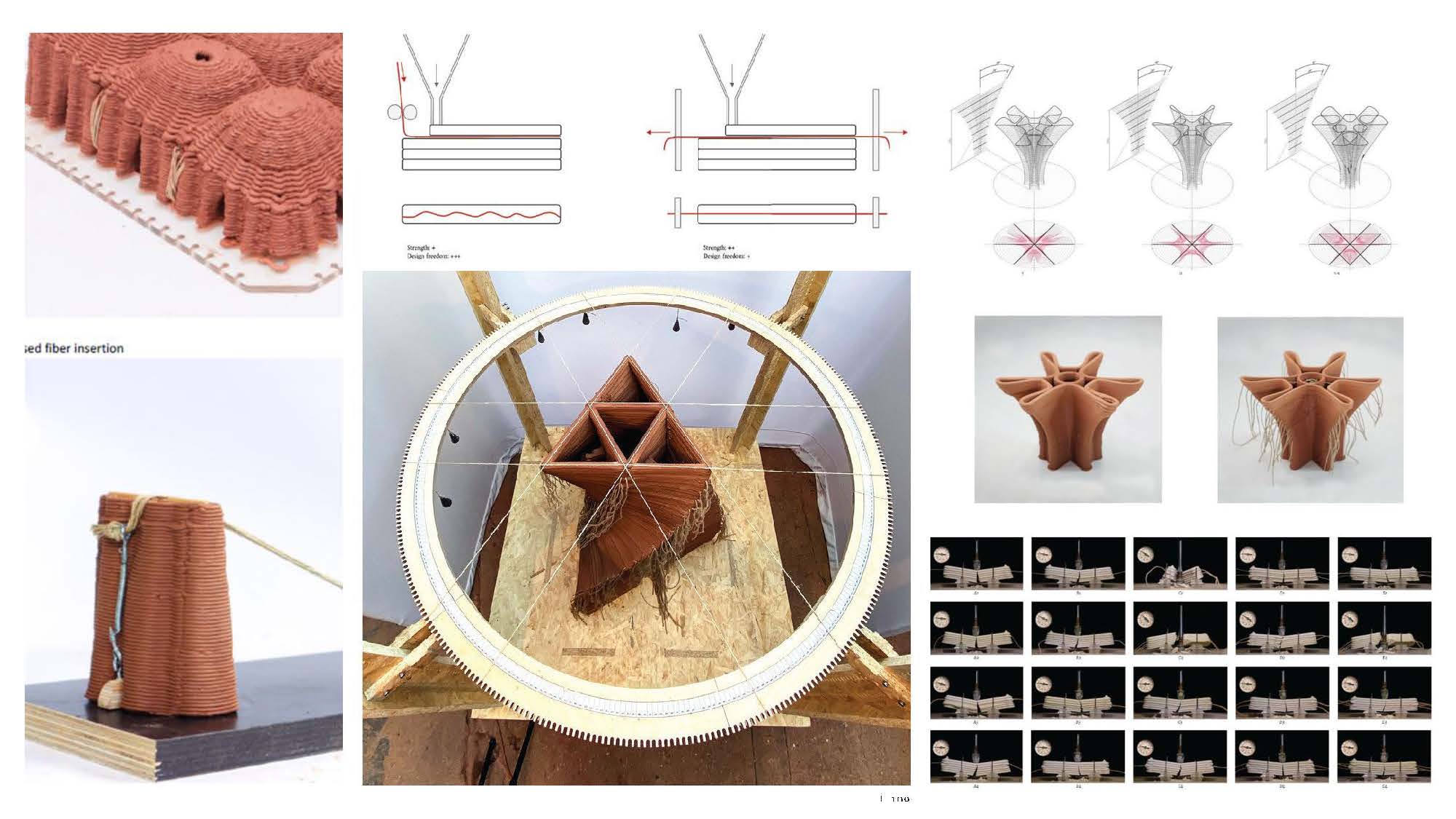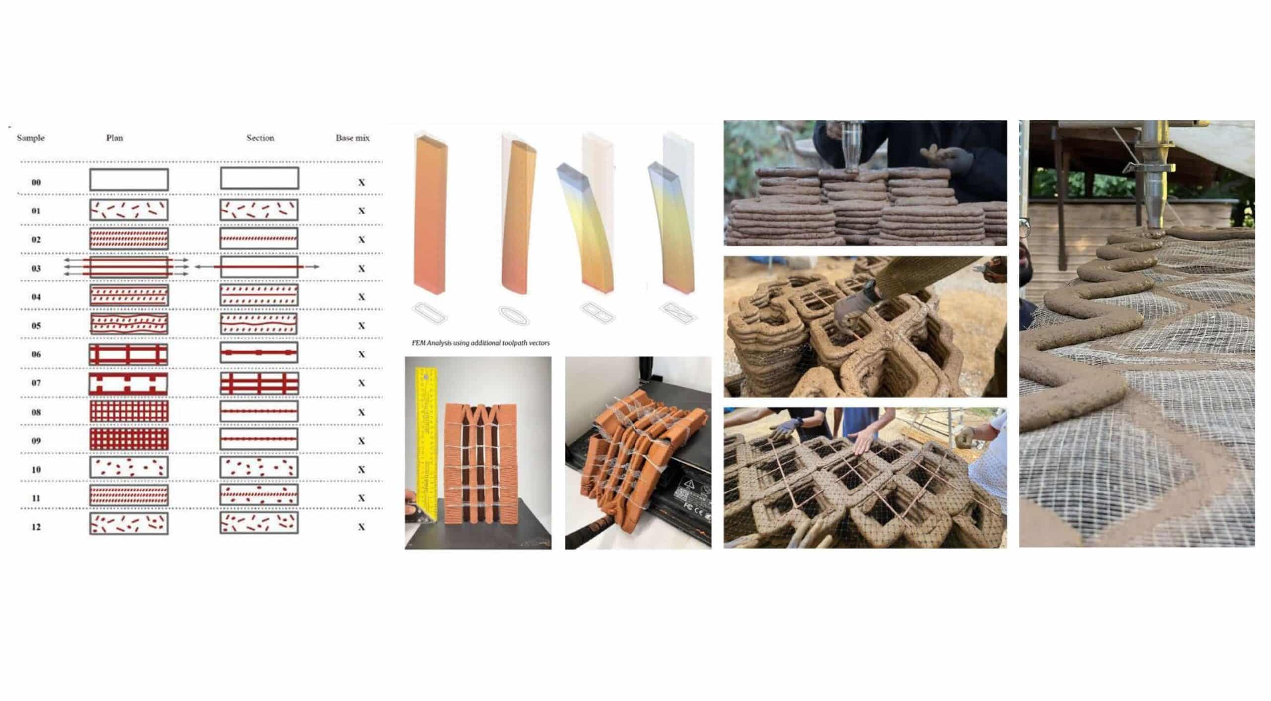 Continuous fiber reinforcement has been used to stabilize clay vaults and cantilevers in the wet state. This strategy reduces cracking, increases durability, and opens possibilities for more complex geometries.