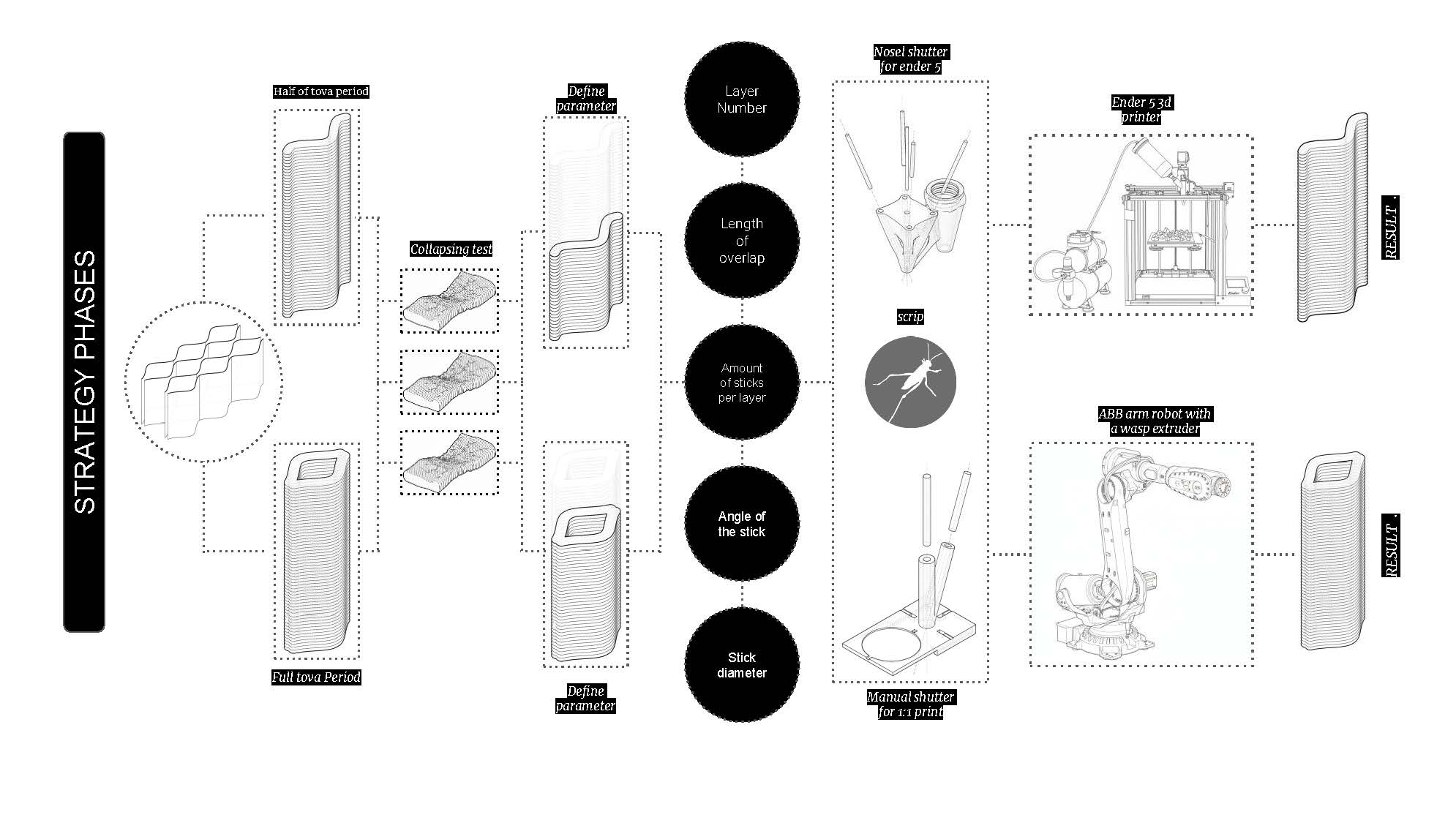 Initial tests defined key parameters such as stick quantity per layer, angle, overlap, and printing period. Collapse tests and insertion tests helped analyze how each variable affected wet-state stability.