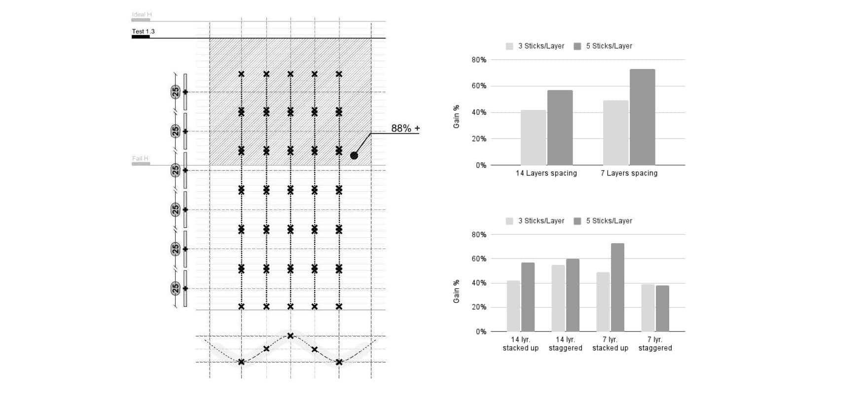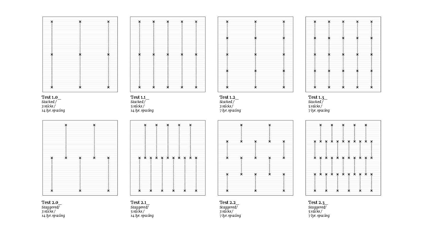 Each configuration was tested with varying numbers of sticks per layer and different vertical spacings. These experiments aimed to understand whether increasing reinforcement density or modifying the pattern has a measurable effect on wet-state performance.