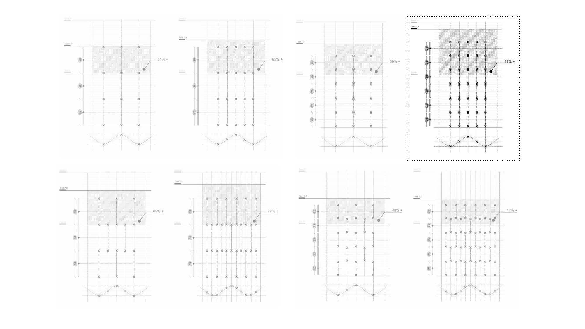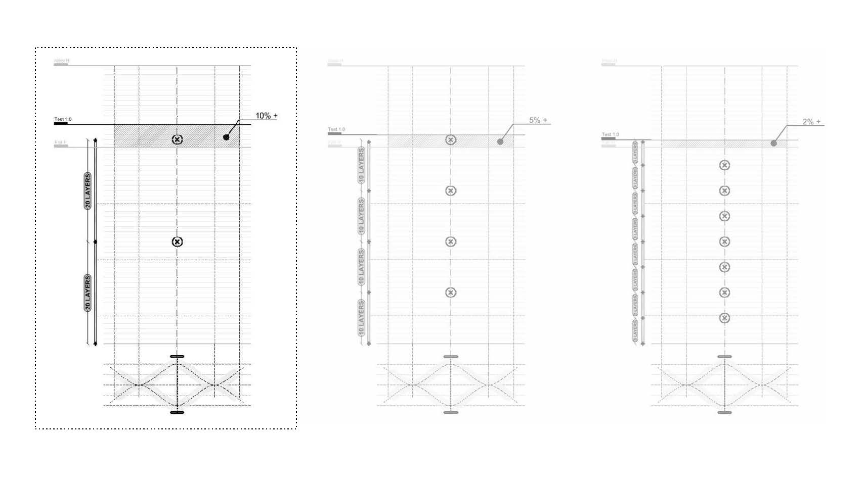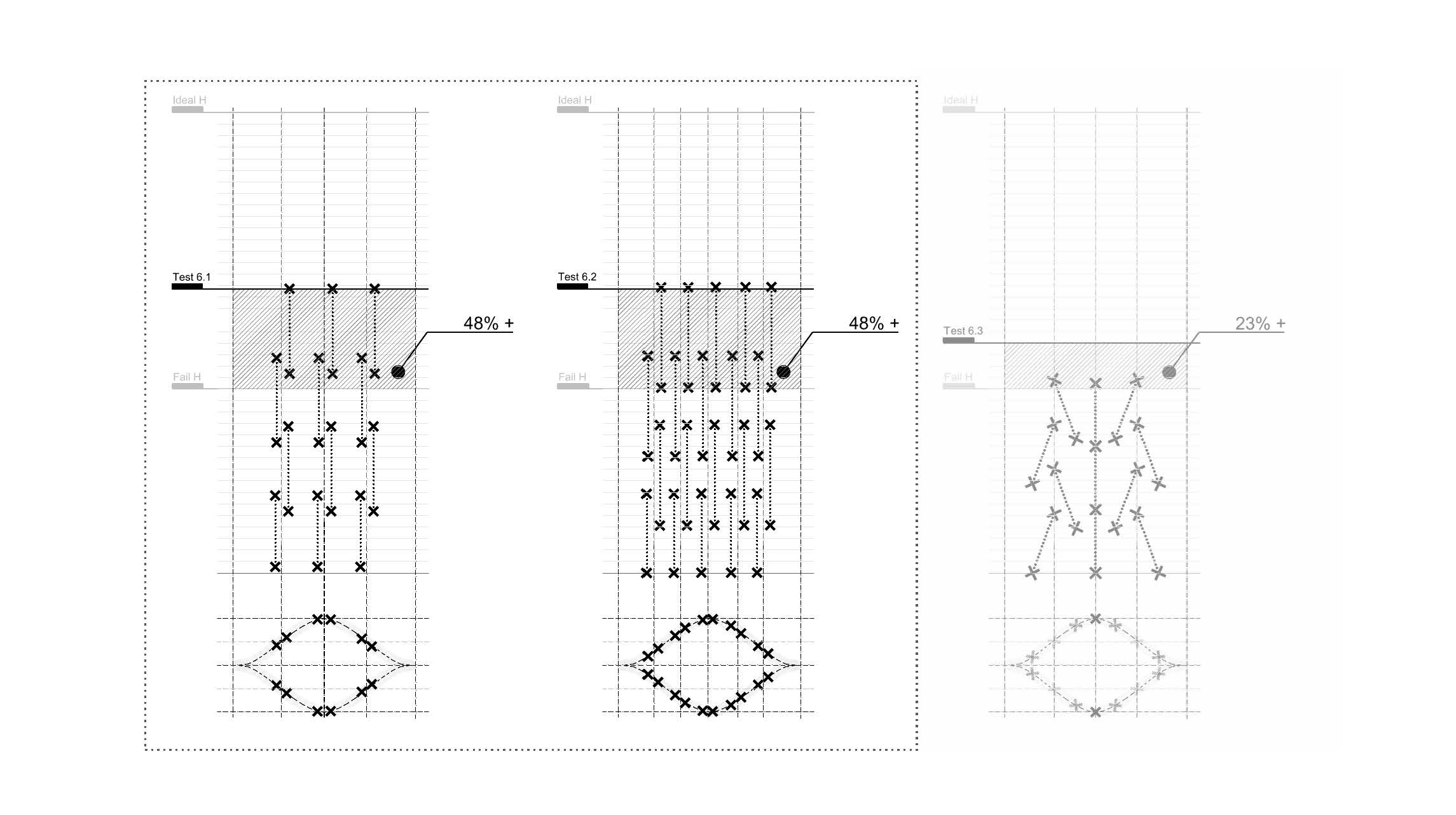 Catalogue 02 examines the effect of vertical overlap between reinforcement elements. Overlap refers to how much the sticks extend through multiple layers rather than ending at a single layer boundary.