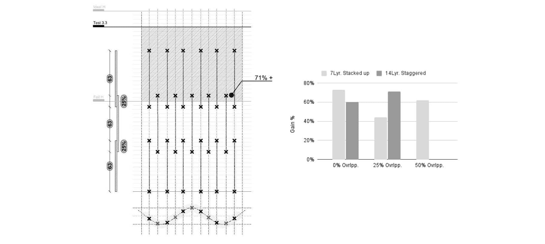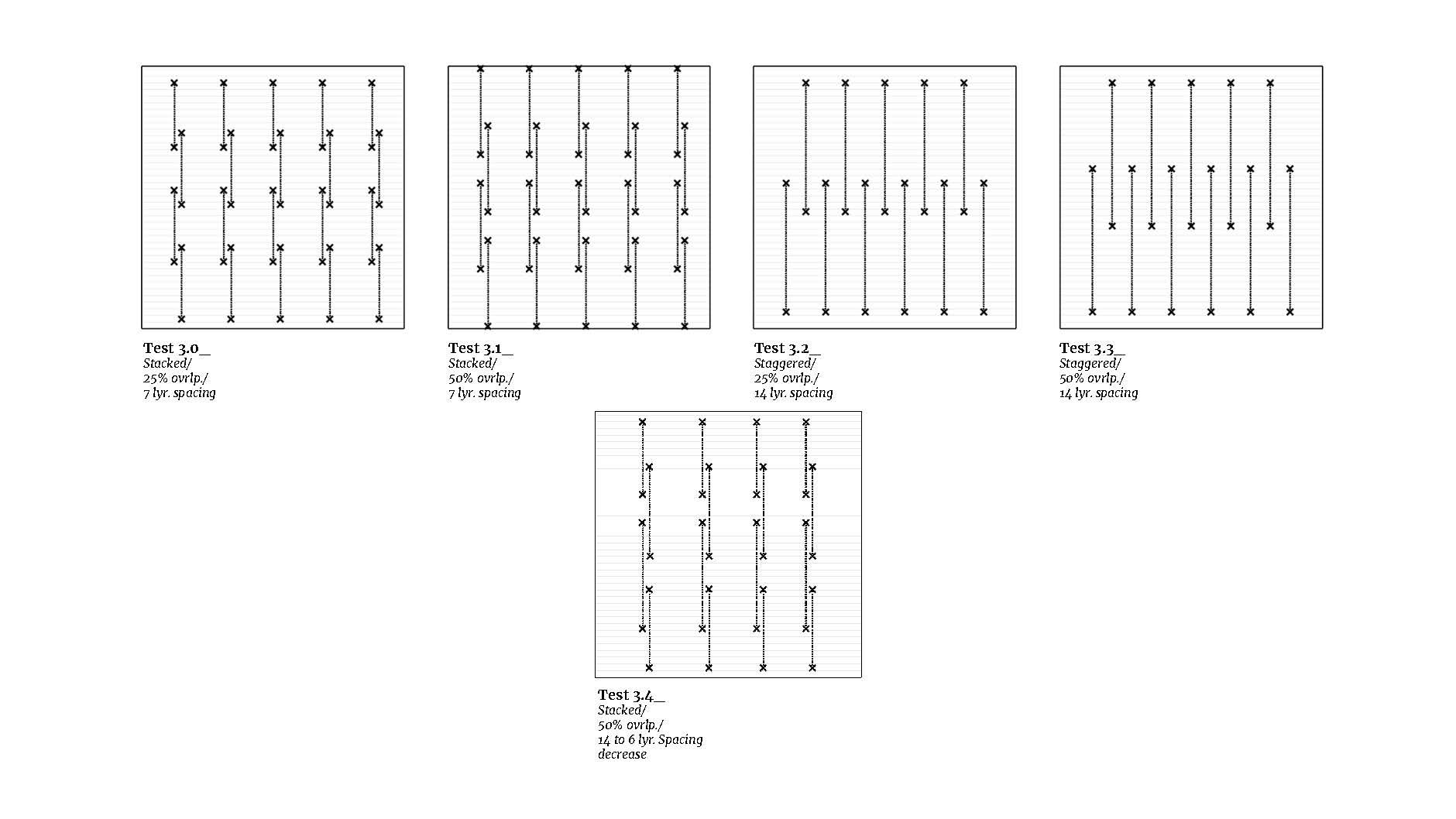 The goal was to evaluate whether greater overlap creates stronger interlayer continuity and helps carry loads more effectively in the wet state. Five configurations were tested, varying both overlap percentages and spacing strategies.