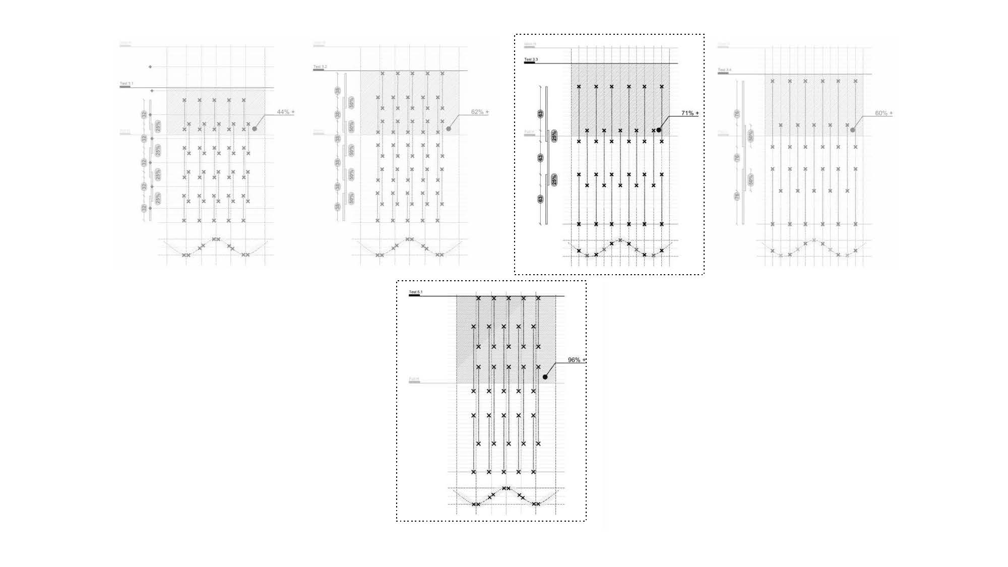 In this catalogue, we explored whether diagonal reinforcement could contribute to wet-state stability. Six different patterns were tested, all incorporating inclined sticks inserted between layers.