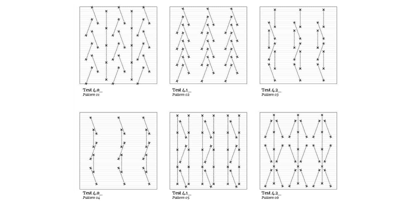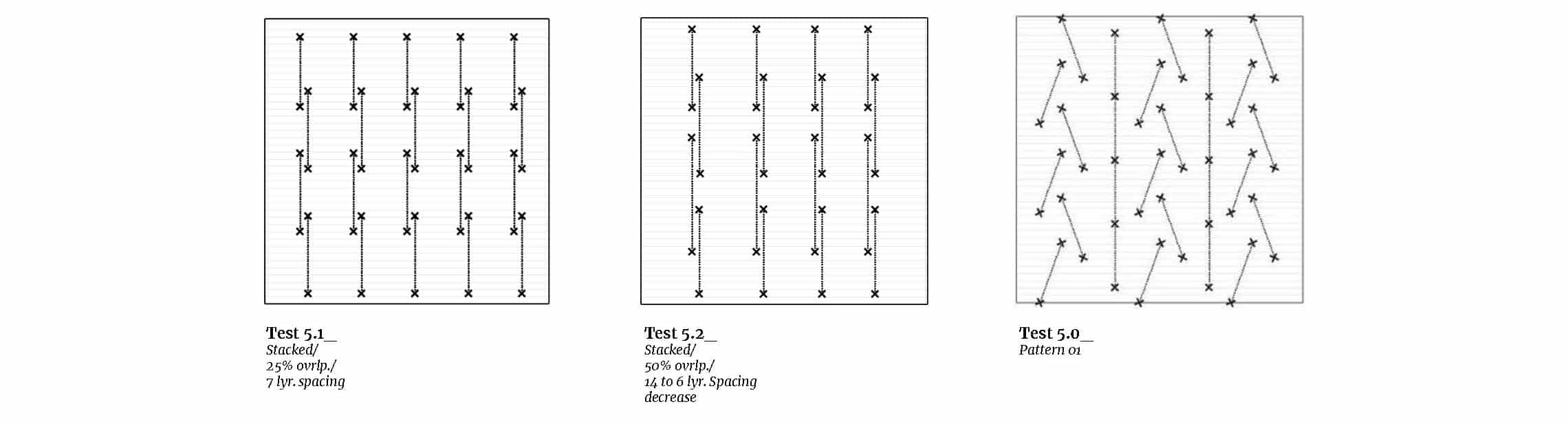 Catalogue 01 explores how different reinforcement arrangements affect the overall buildability of the printed wall. Two main patterns were tested: