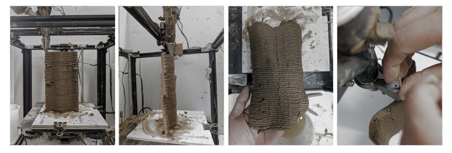 Although the prints performed well, they did not reach the full expected height. This was due to the earth mixture reaching its plastic limit, meaning the material could no longer support additional weight while still wet.