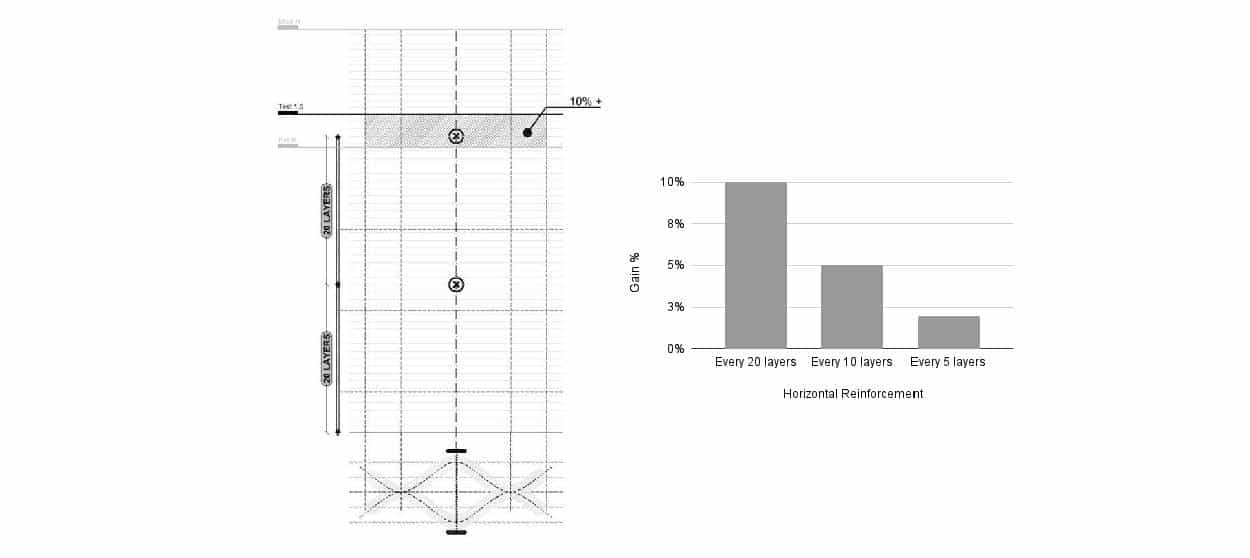 - Vertical reinforcement significantly improved the achievable height and reduced deformation.