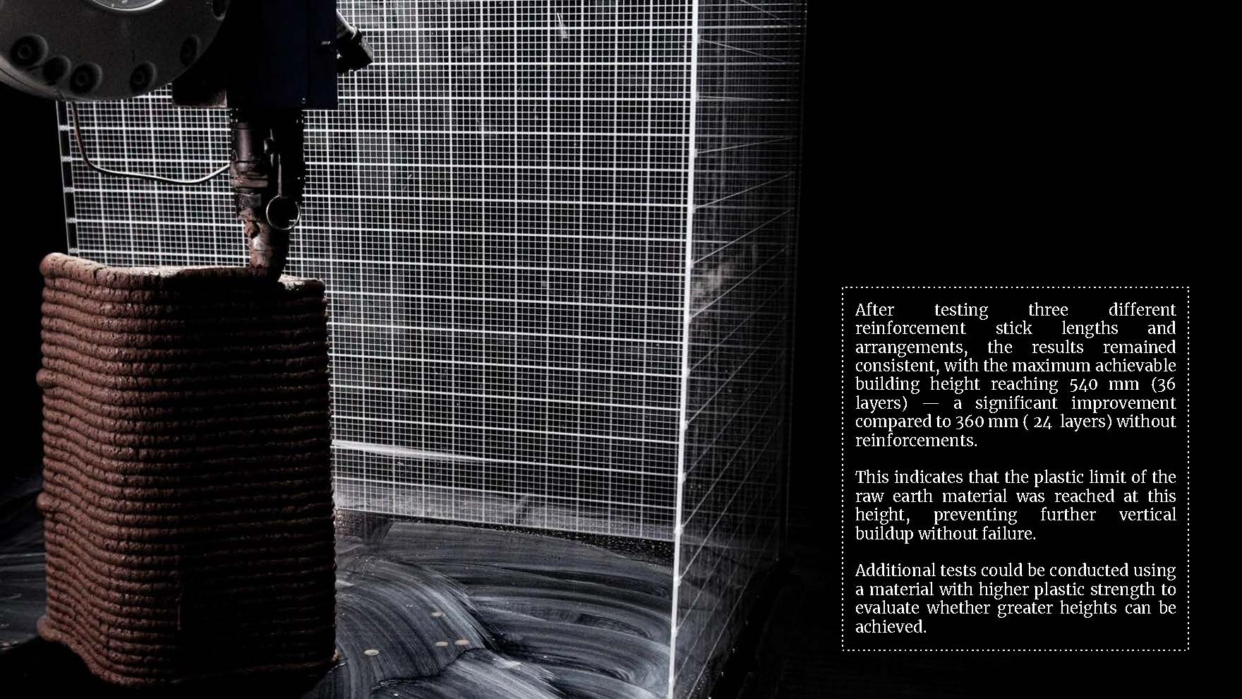 Previous IAAC research has focused mainly on horizontal reinforcement systems, which improve interlayer bonding and reduce buckling. However, vertical reinforcement in 3D-printed earthen walls remains largely unexplored.