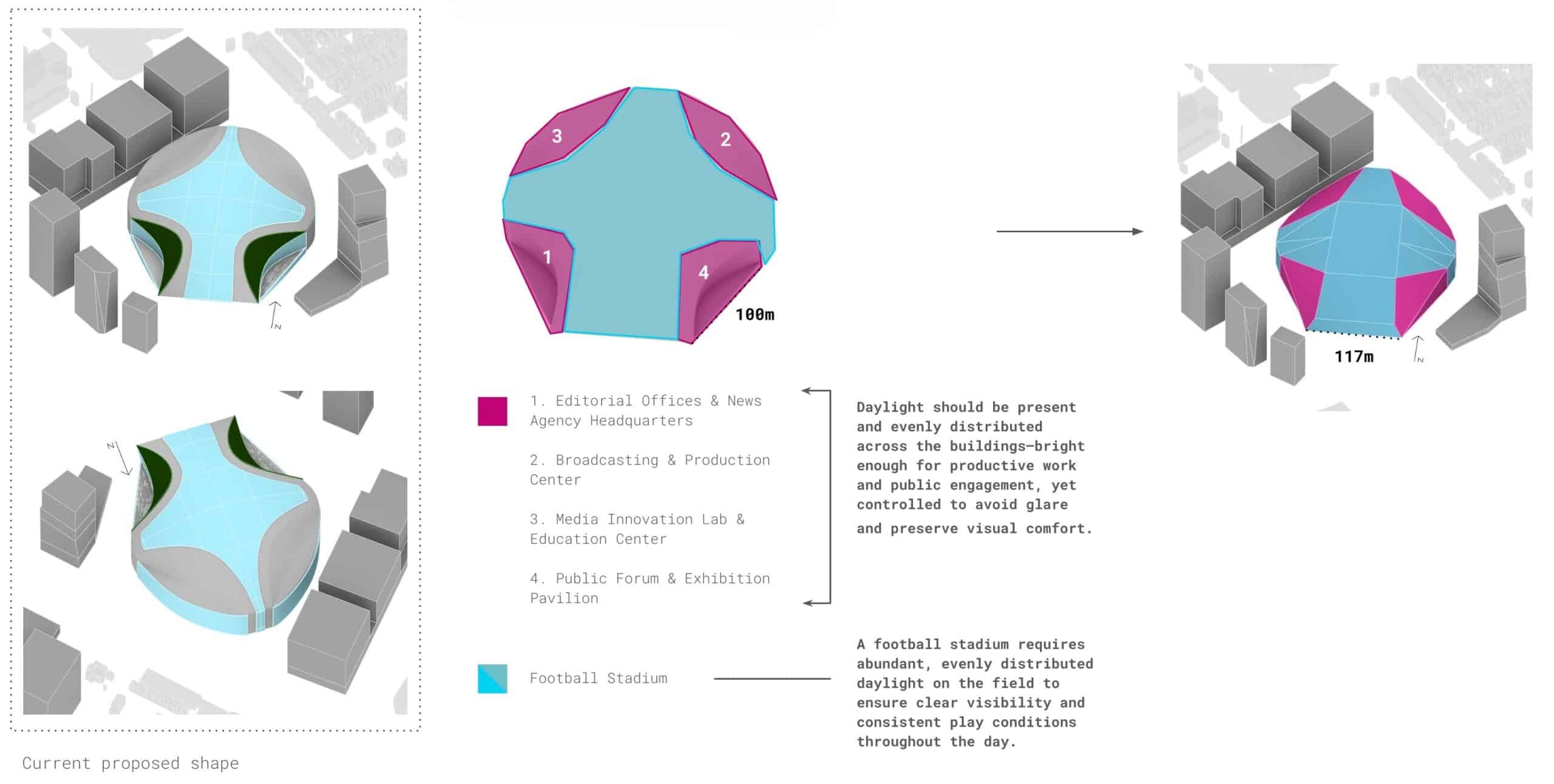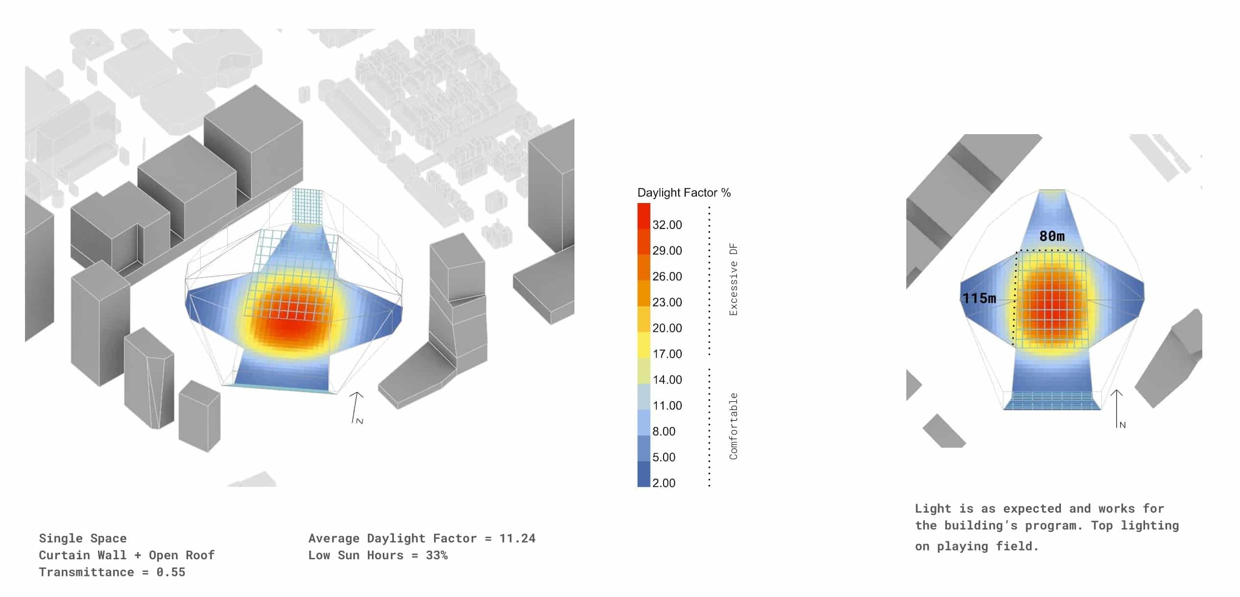 Daylight Comfort: We evaluated interior daylight conditions by distinguishing between the two main programs of the building: the stadium in the center and the office buildings on the sides.