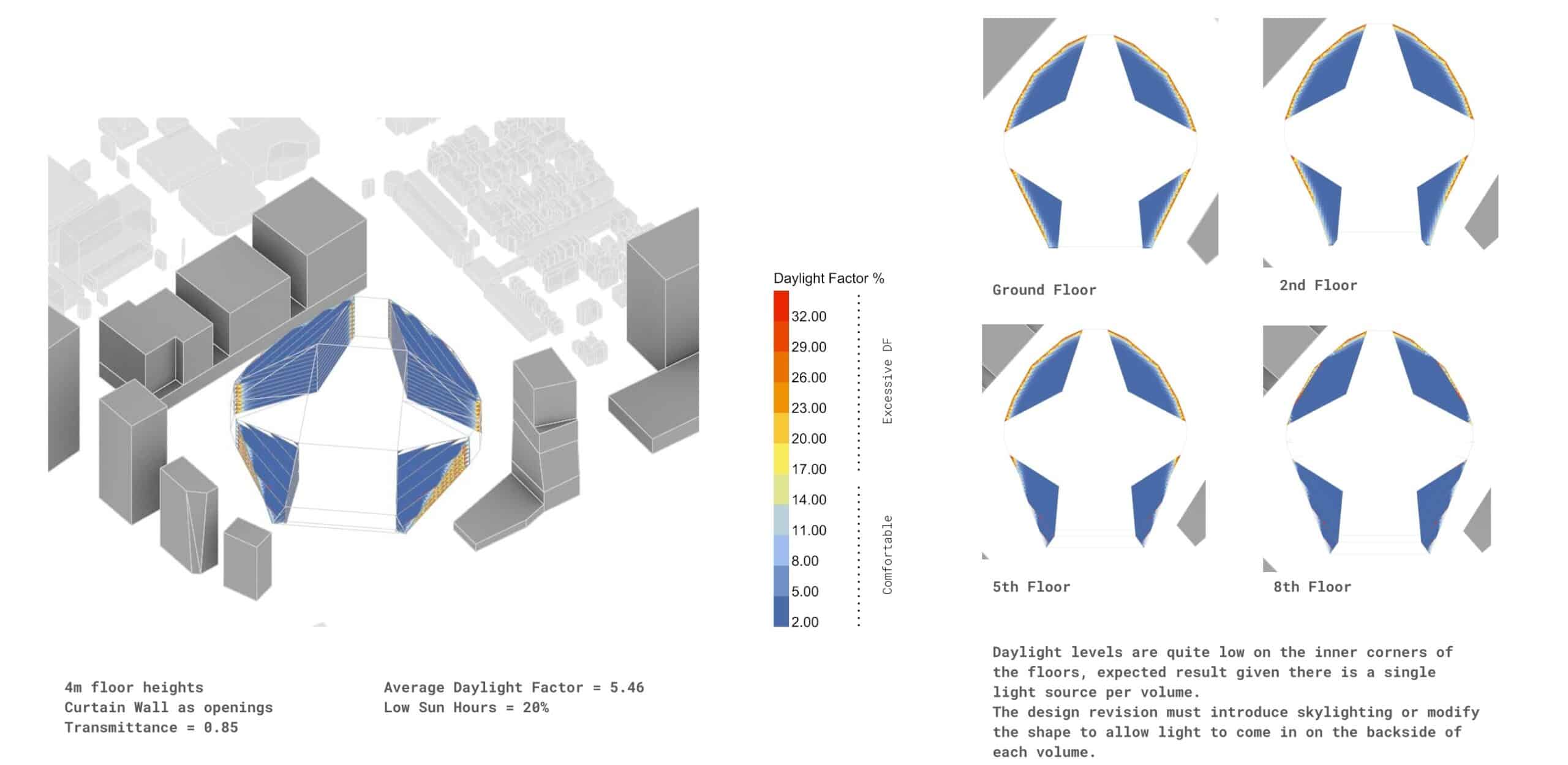 However, the news wasn’t all bad. We found that the project actually performs well in orientation, interior daylight, and wind resistance without major intervention. We wrapped up our project by rendering our optimized design to visually compare how these data-driven decisions improved upon the existing development.