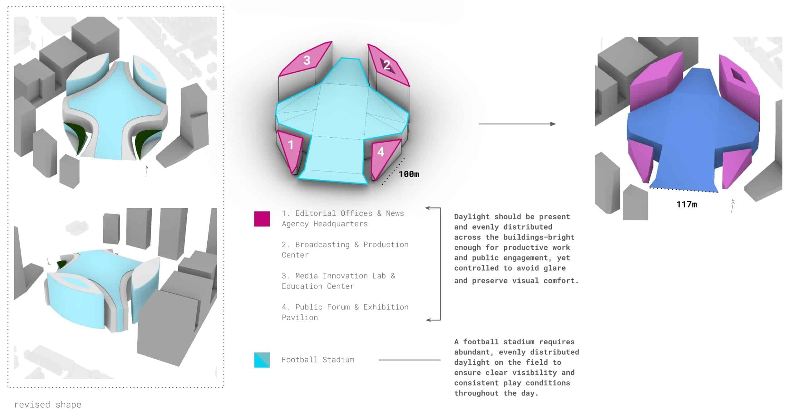 The data exposed clear shortcomings in exterior thermal comfort, compelling us to implement significant shape revisions rather than slight adjustments. Specifically, to mitigate the heat-trapping effects we identified in the courtyards, we altered the scale of the towers surrounding the stadium and populated the zones where heat lingers with trees.