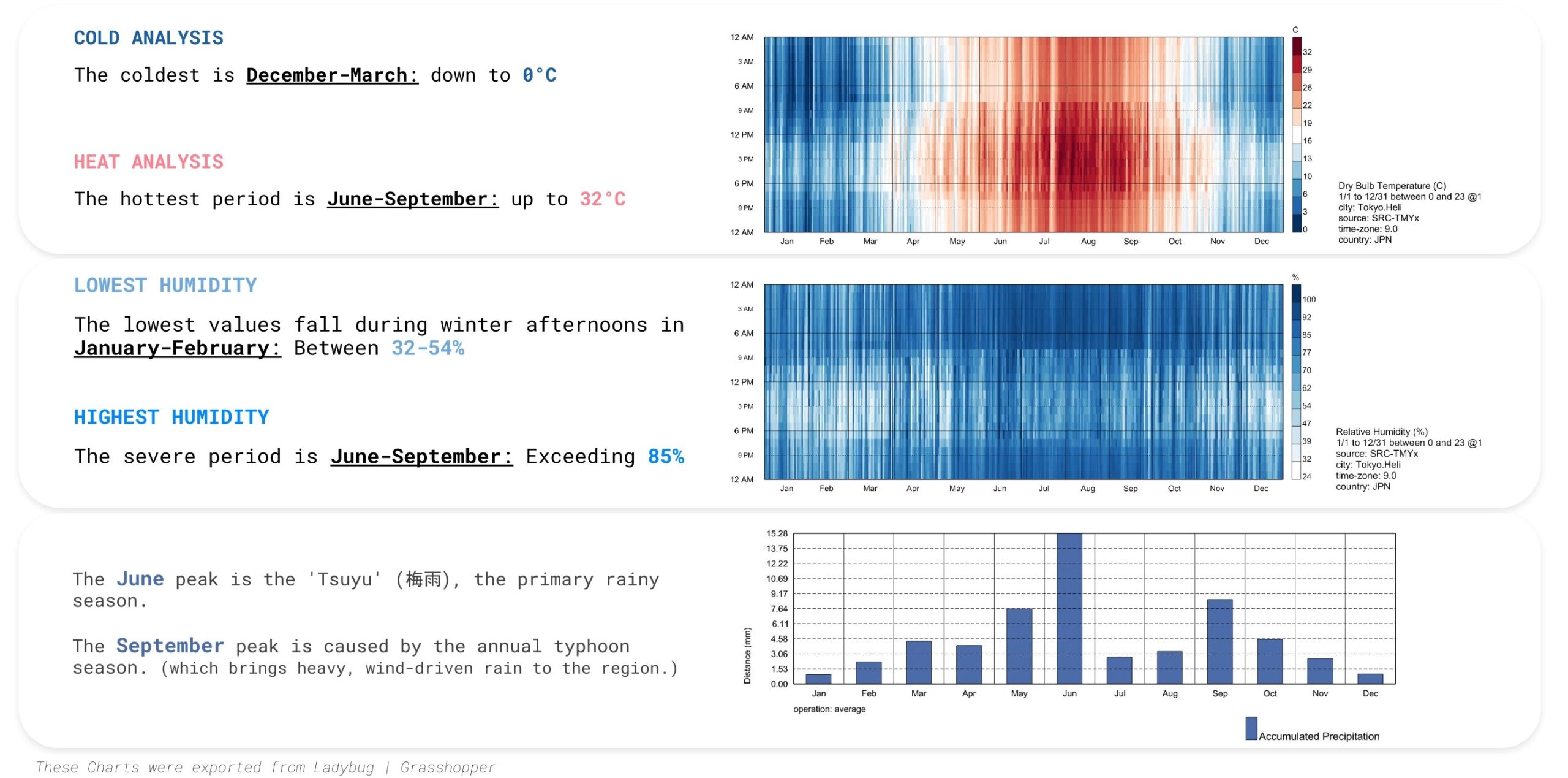 Our analysis addressed Tokyo’s humid subtropical climate. We identified specific seasonal extremes as primary design challenges, particularly from June to September, when temperatures reach 32°C and humidity exceeds 85%. Our microclimate analysis suggests that Tokyo presents a “harsh” climate where total comfort requirements are rarely met. This creates a “dual battle” for the site: it faces cold stress during the winter and significant heat trapping during the summer.
