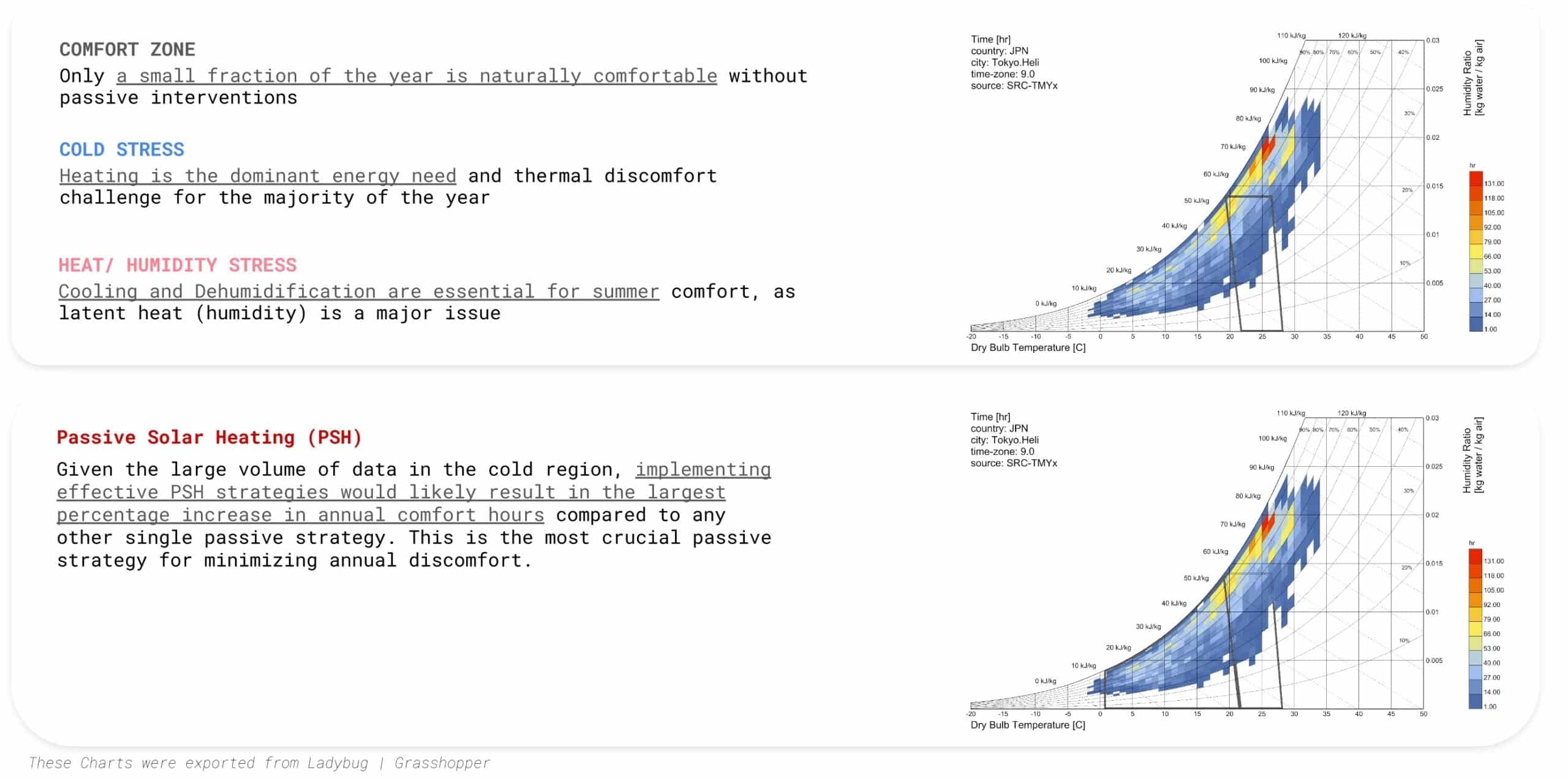 Psychrometric: The analysis derived from the chart suggests that implementing Passive Solar Heating (PSH) is the most crucial strategy. This single intervention would likely result in the largest percentage increase in annual comfort hours compared to any other passive strategy.