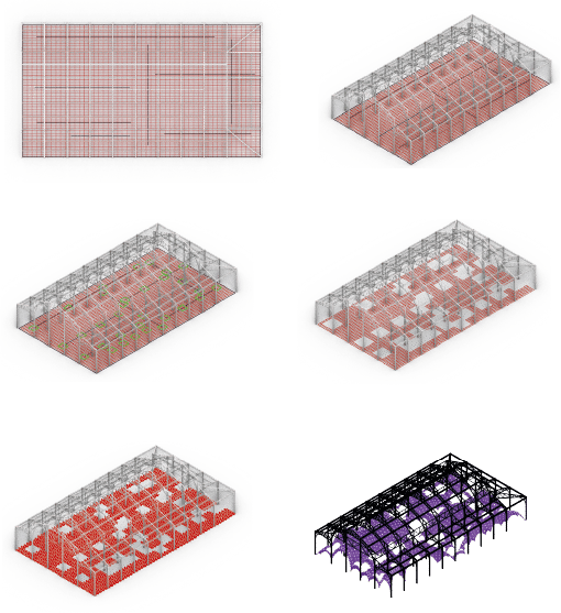 Despite my initial doubts, I started to work on the original roof panels that were given to us in the model. To my surprise, this approach was working effectively. However, I had to change my vortex landings and make them more organized. For that, I defined polylines through the panels and divided them to form rectangles for the holes. I still wanted to anchor the inner edges towards the ground and inflate the mesh upwards, yet the already existing structural system of the market was disturbed more than it to be solved. Consequently, my light vortexes had to reach towards the sky instead of the ground.