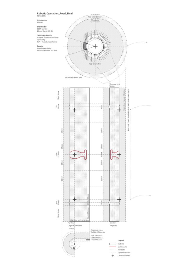 Using the robot for its precision and control we began to explore how we could cut the reed using an ABB140 and a 2mm millbit. From earliest attempts trying to just calibrate the asymmetries of the material as a warped cylinder we managed our first cuts.