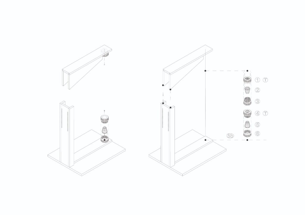 One thing we realised from our first jig and cutting experiments was that in order to be able to reach as much surface area of the material of possible we would need to move to a vertical set up and develop a system which could adapt to a tight grip regardless of the reed piece’s diameter. We managed to achieve these improvements with our second jig iteration using an adaptable-heigh bridge and a 3D-printed collet fastening system.