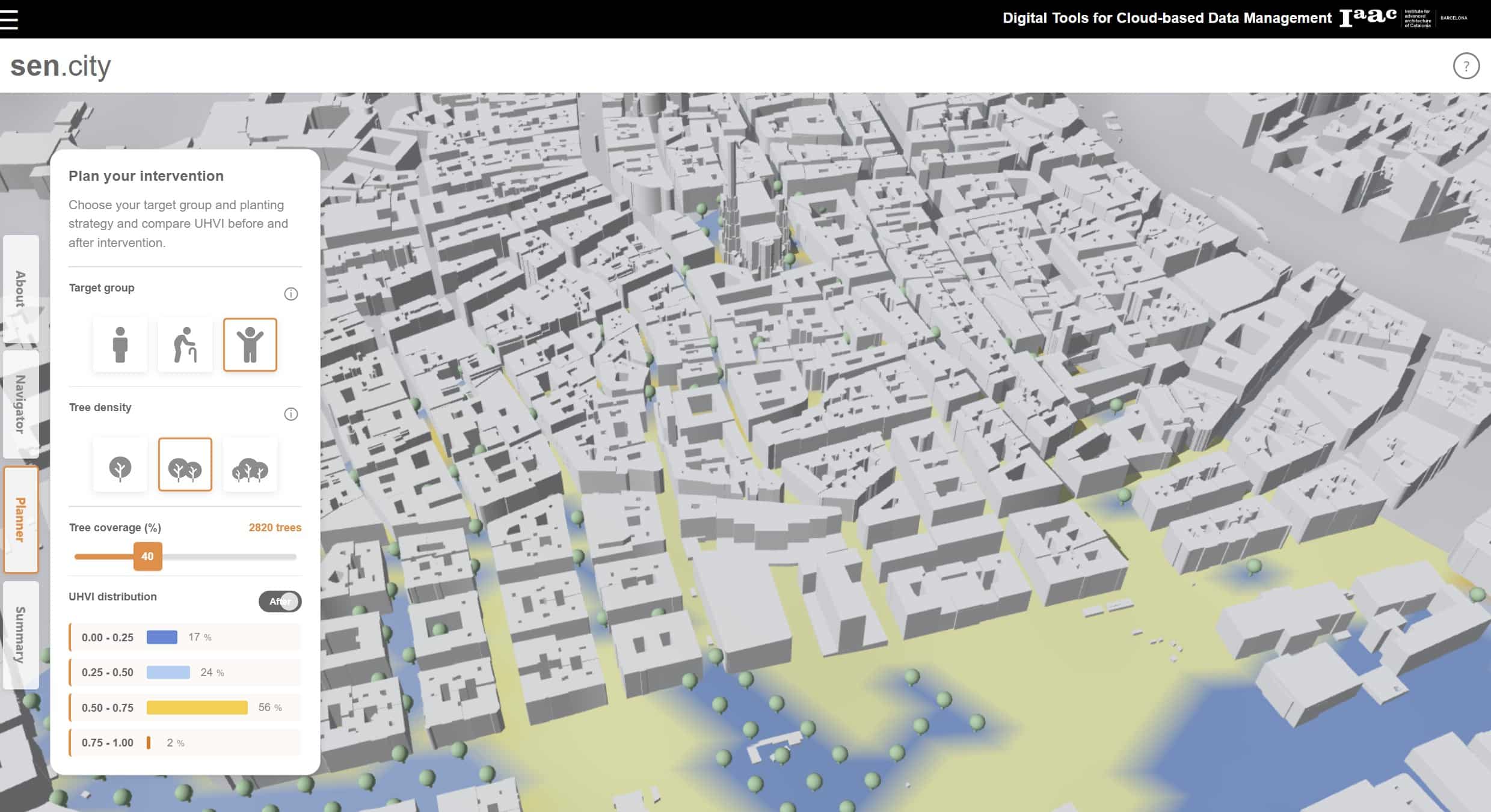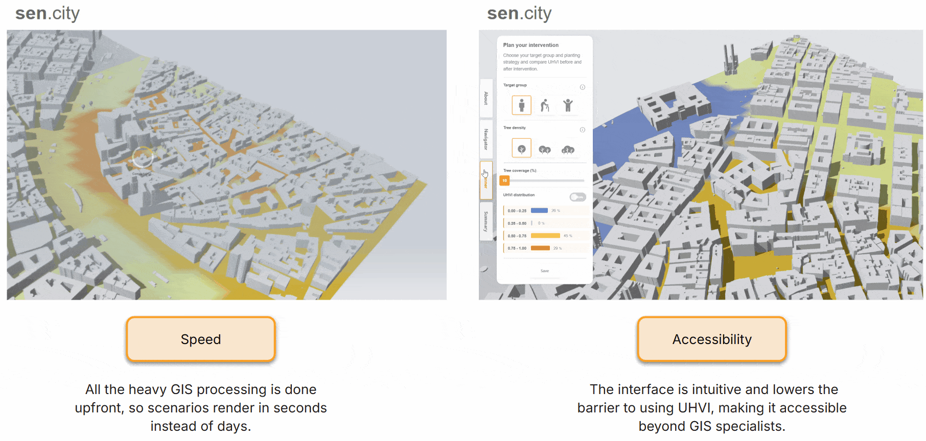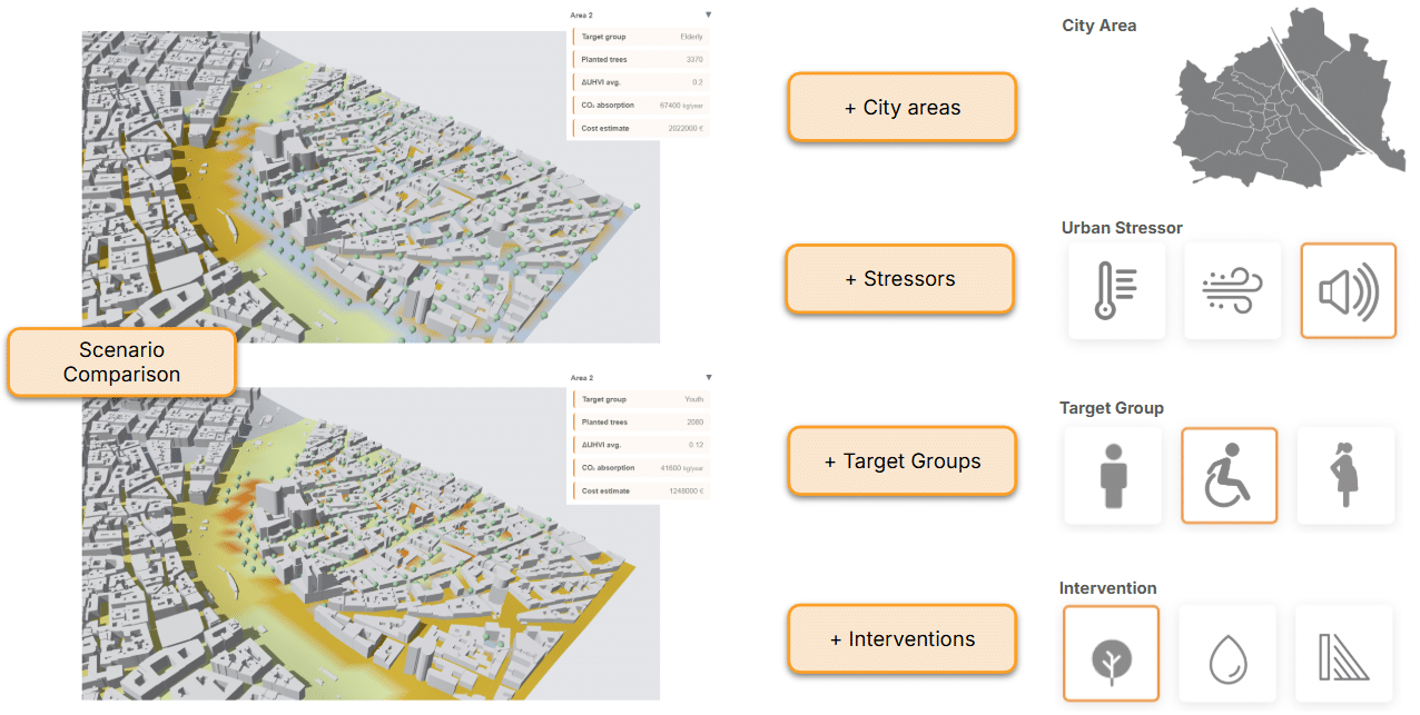 Sen.city transforms Vienna’s static UHVI dataset into an interactive planning environment. It makes vulnerability understandable at a glance and lets users instantly simulate the cooling impact of new trees.