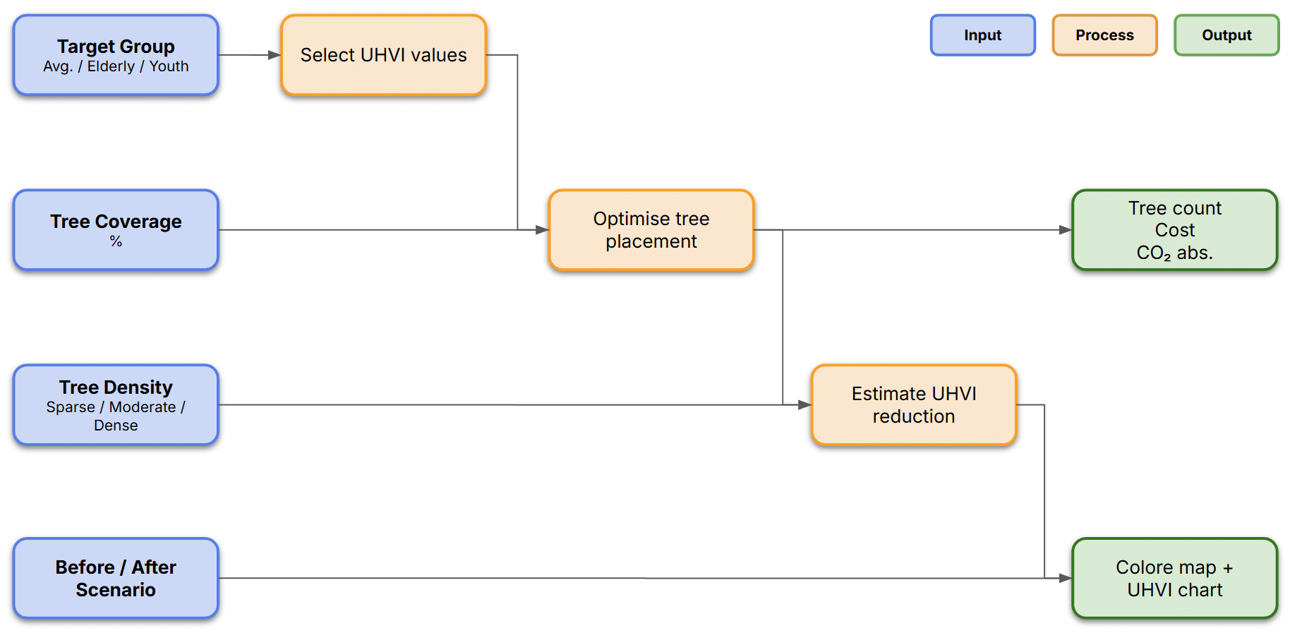 Once the data is mapped, the app becomes fully interactive. It takes user inputs — target group, tree density, and coverage — optimise tree placement and updates the UHVI map in real time to show the cooling effect.