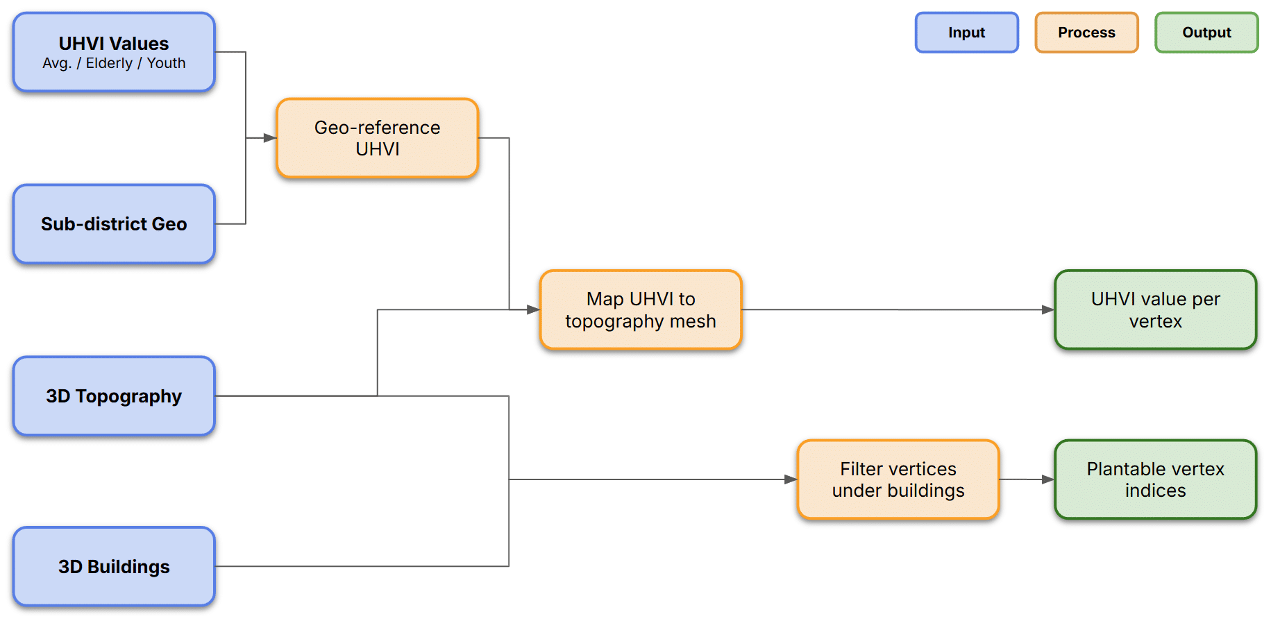 We started from Vienna’s official UHVI dataset — available for the general population, the elderly, and youth. We georeferenced these values and mapped them onto a 3D topography mesh of four central districts, the stored the lists of UHVI value per vertex together with suitable-for-planting locations.
