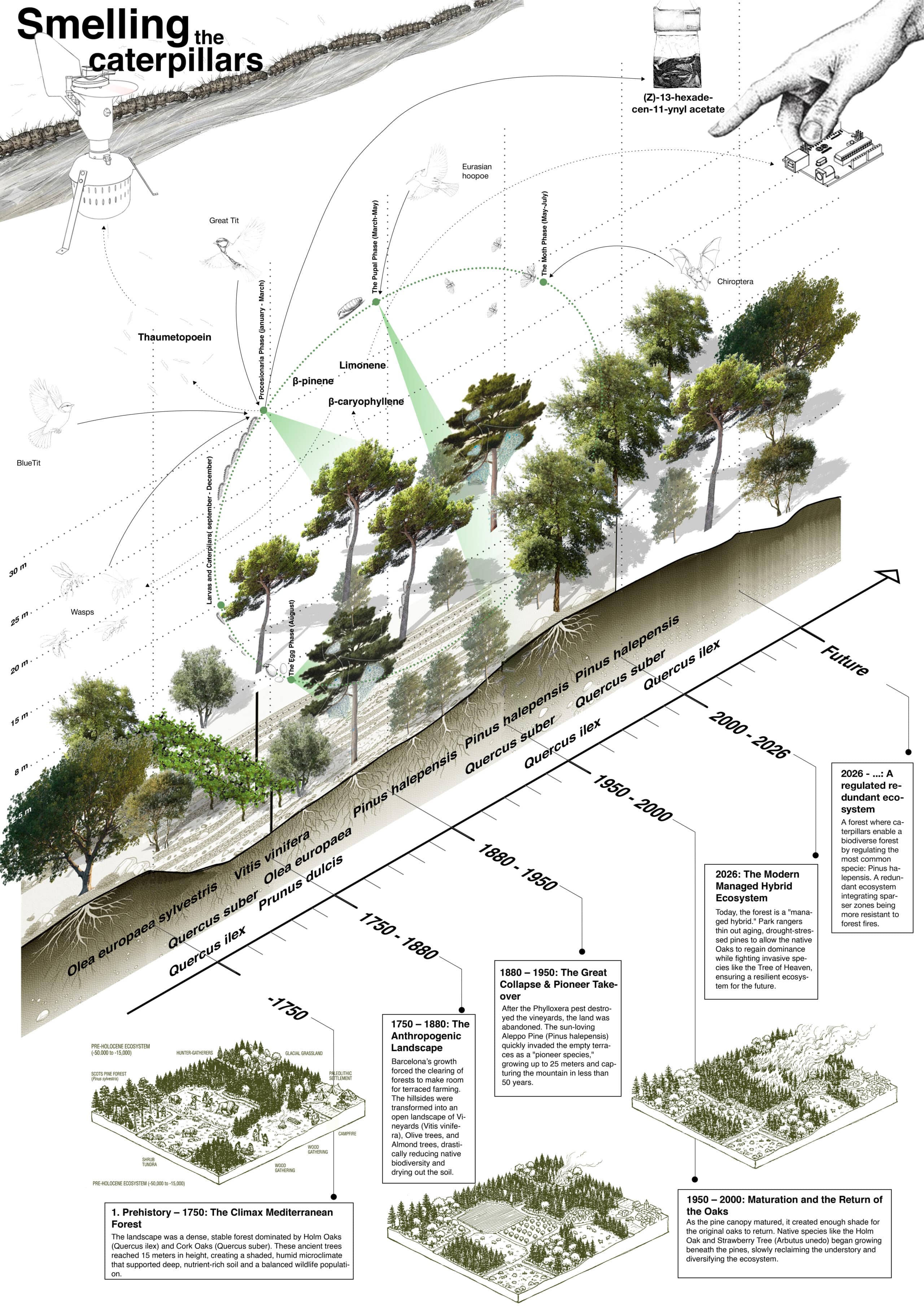 The landscape has undergone a dramatic transformation, beginning with the Virgin Oak Era, where deep-rooted, ancient forests dominated a stable and rich ecosystem. This wilderness eventually gave way to the Agricultural Era, characterized by the intensive cultivation of vineyards and olive groves that reshaped the soil structure through terracing and man-made interventions. Following the decline and eventual abandonment of these vineyards, the land entered a Pine Takeover and Mixed Transition phase, where pioneer species and dense shrubs reclaimed the untended ground. This movement, exacerbated by the rural exodus, has lead to an increasing surface of young pine forest ecosystems around Barcelona particularly vulnerable to forest fires. From 1960 to 2018, the total surface of Catalunya occupied by forest has climbed from 40% to 60%. Today, the Managed Restoration Era seeks to balance ecological recovery with modern landscape stewardship.