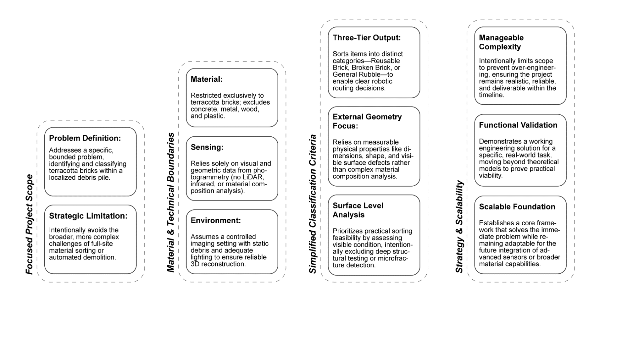 This project aims to enable the autonomous recovery and reuse of terracotta bricks from demolition sites by building a system that takes site scan data, demolition debris, classification criteria, and storage layouts as inputs, processes them through a sequence of core functions — site scanning, material detection, condition assessment, material classification, sorting instruction, pick and place, and reporting — and produces two key outputs: a physical sorting of bricks into full, broken, or rubble categories, and a digital inventory complete with classification data and reuse potential metrics.