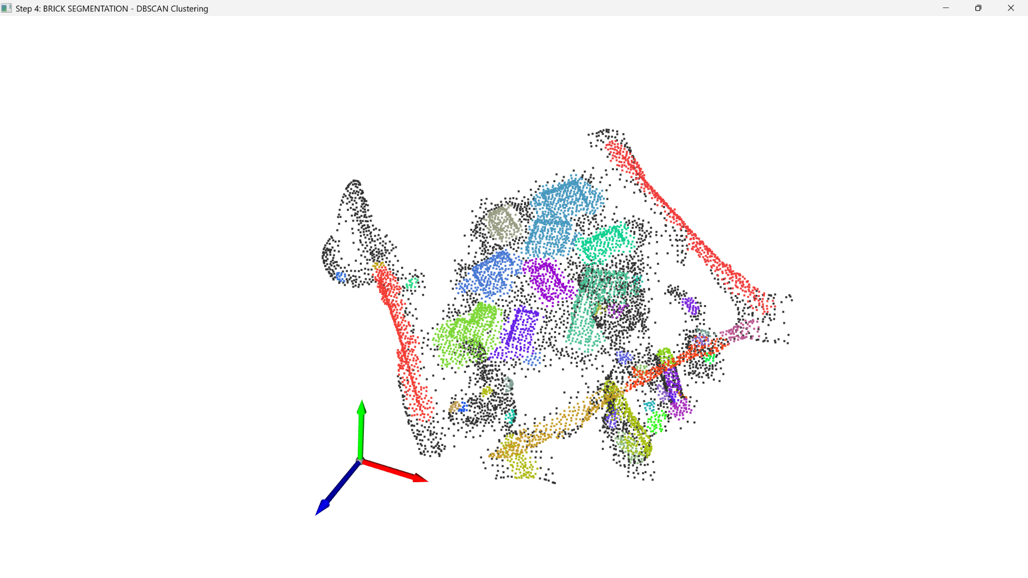 n the end we used Density Based clustering (DBSCAN) to identify the bricks in our model. This works by analyzing the relationship random points have with their neighbours. It looks at both: