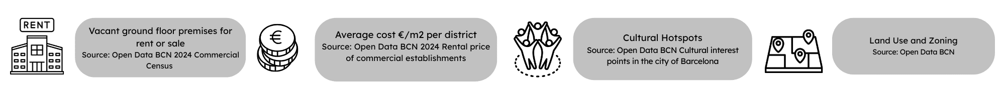 We coded the dashboard with python in Visual Studios Code to reflect the city’s census of vacant ground-floor commercial spaces to show which spots were available to rent or buy in 2024, with green (or “si”) marking locations in busier areas and red (or “no”) for quieter ones. We overlap the average cost in € per m2 cost for each district helping an entrepreneur to shape their businesses meaningfully. The dashboard shows ideal land uses important for business owners to understand before committing to a location. Finally, we added cultural hotspots throughout Barcelona. The dashboard also provides context around frequent foot traffic that may reflect a wider range of drop-in customers.