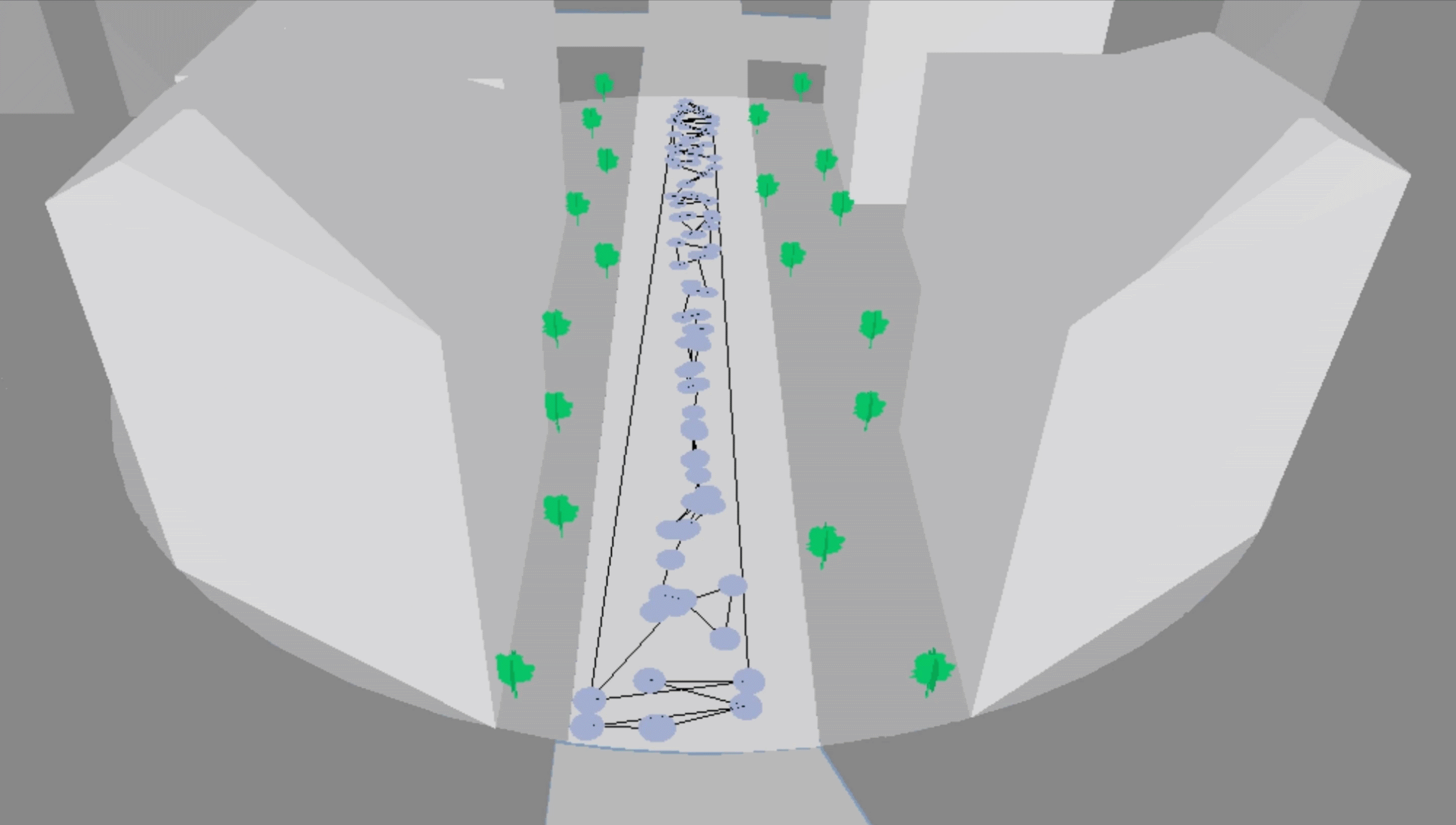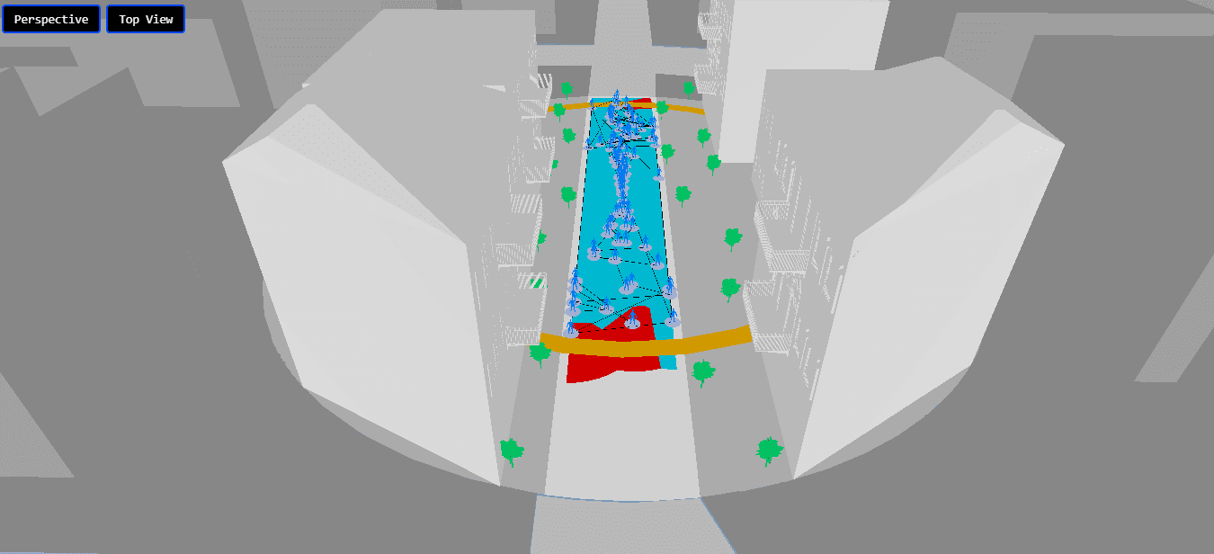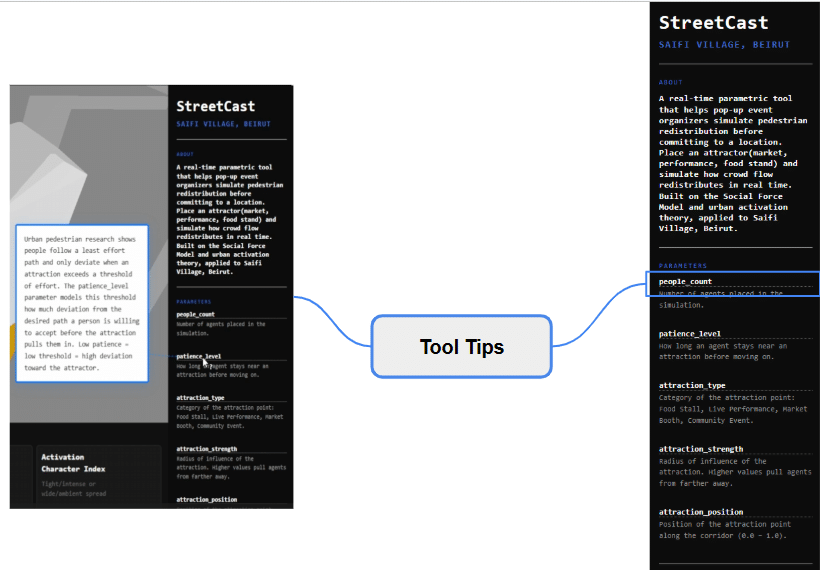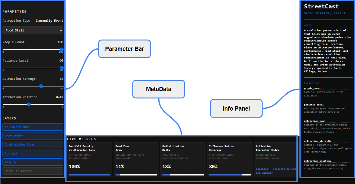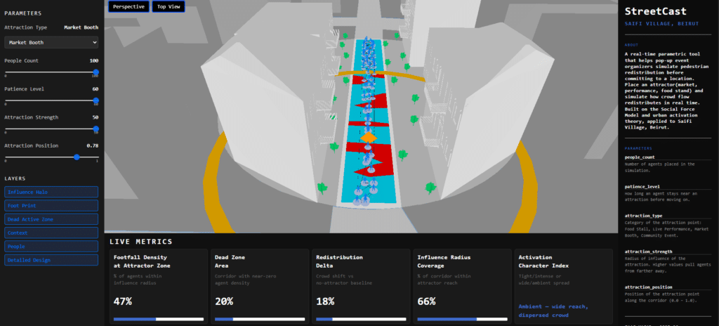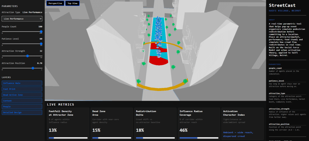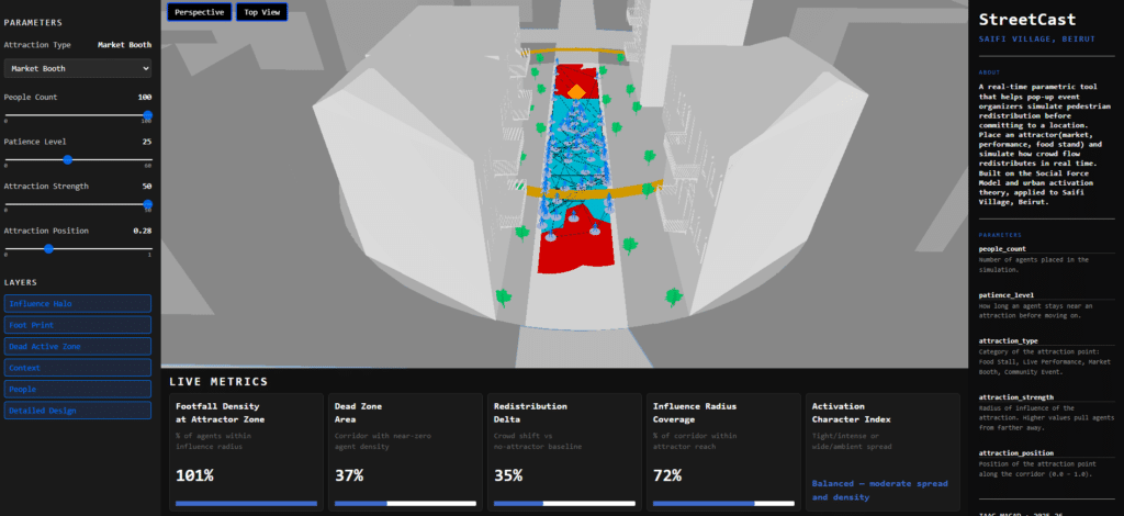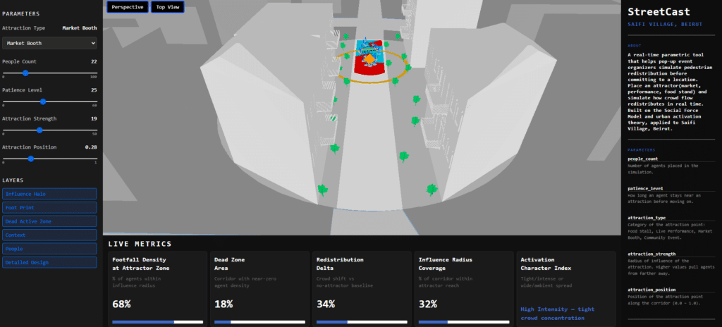 The tool allows users to place a programmatic attractor within a defined corridor and simulate how it redistributes pedestrian flow in real time. By adjusting parameters, users can predict where foot traffic will concentrate, which areas will remain underutilized, and what placement strategy maximizes engagement.