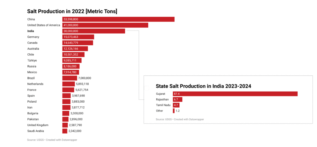 Today, India is one of the world’s largest producers of salt, and the state of Gujarat alone accounts for over 80% of the country’s production. Much of this salt is harvested through solar evaporation in the Little Rann of Kutch, where the Indian Wild Ass Sanctuary overlaps with traditional salt-producing lands. The workers here, known as Agariya, produce a significant share of India’s salt under extreme climatic conditions. Despite their economic contribution, they operate in legally precarious circumstances: after the sanctuary’s declaration in 1978, many lost formal land rights and today work in a space defined by informality, environmental regulation, and limited social protection.