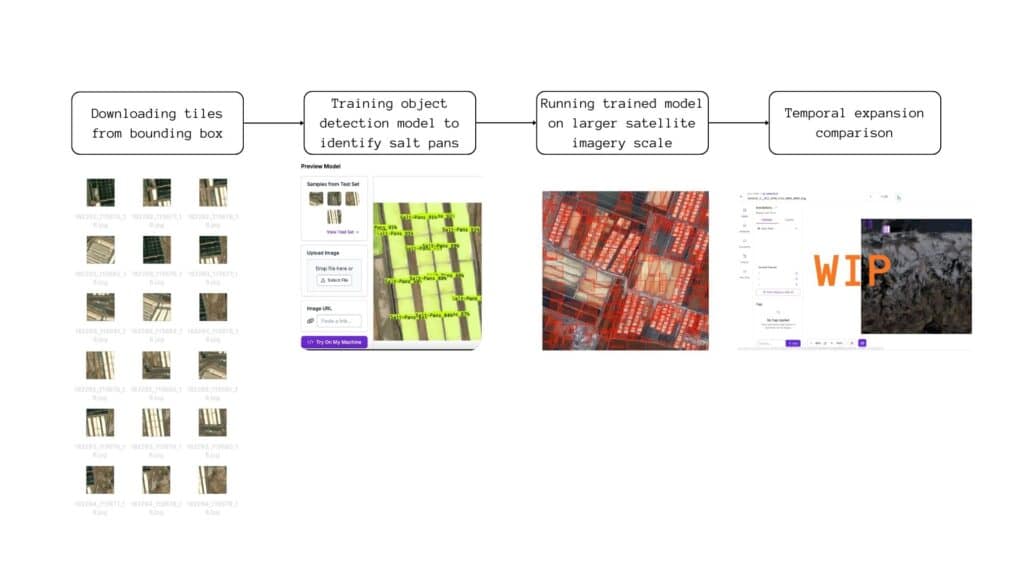 We are currently retraining our Roboflow object detection model to better recognize salt pans in older satellite imagery — a challenge given the lower resolution and spectral differences of historical data. Once the model reaches sufficient accuracy, we will use it to systematically identify and verify areas of salt-farming expansion over time. After mapping where expansion has been most significant, we will investigate additional environmental and socio-spatial factors to better understand the less visible dimension of our research: the quality of life of the Agariya farmers. By integrating ecological datasets and human-centered layers, such as land-use maps and settlement data, we aim to build a more comprehensive understanding of how landscape transformation intersects with lived realities.